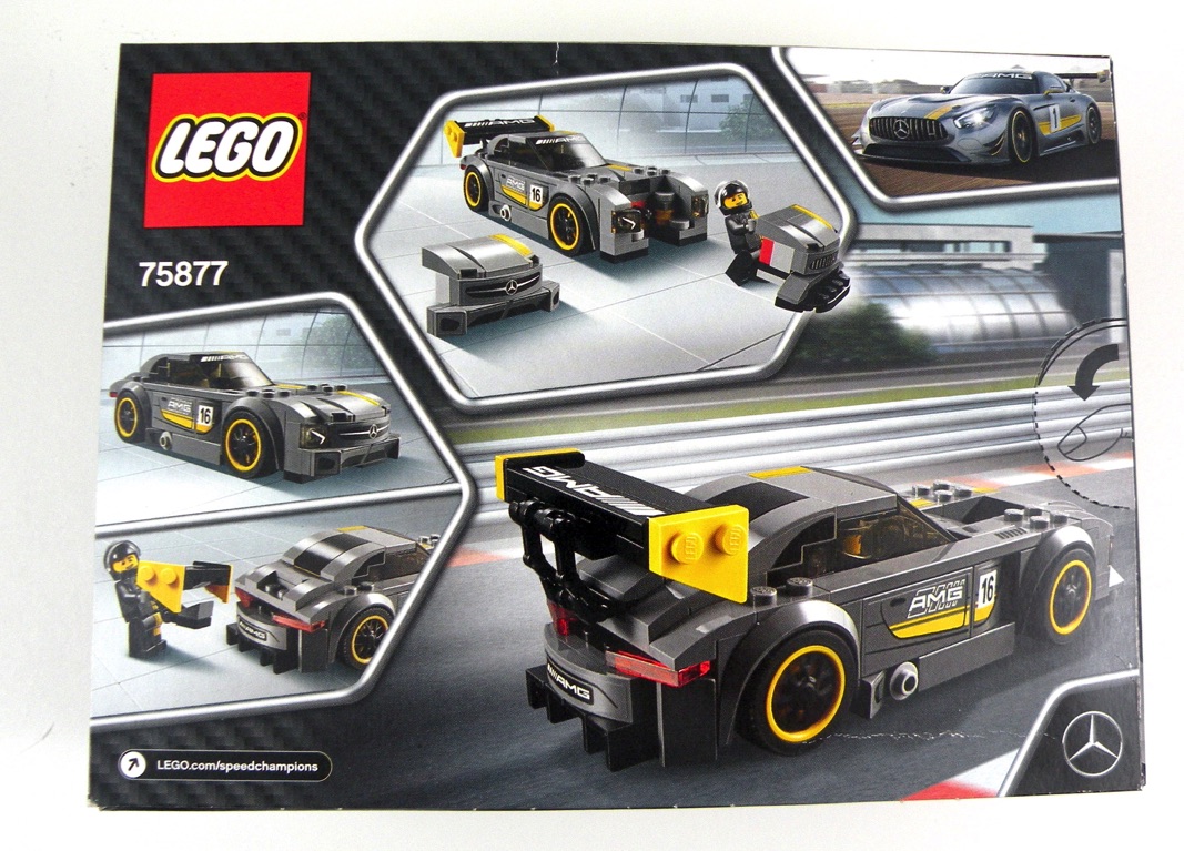 Nous retrouvons une boîte au format classique pour une voiture seule de la gamme Speed Champions. Sur l’avant, la voiture dans ce qui semble être un garage, avec le pilote-mécanicien en train de ramener le capot « standard » afin de repasser la voiture dans une autre configuration. On retrouve évidemment le logo de la gamme, et le logo Mercedes en bas à droite.