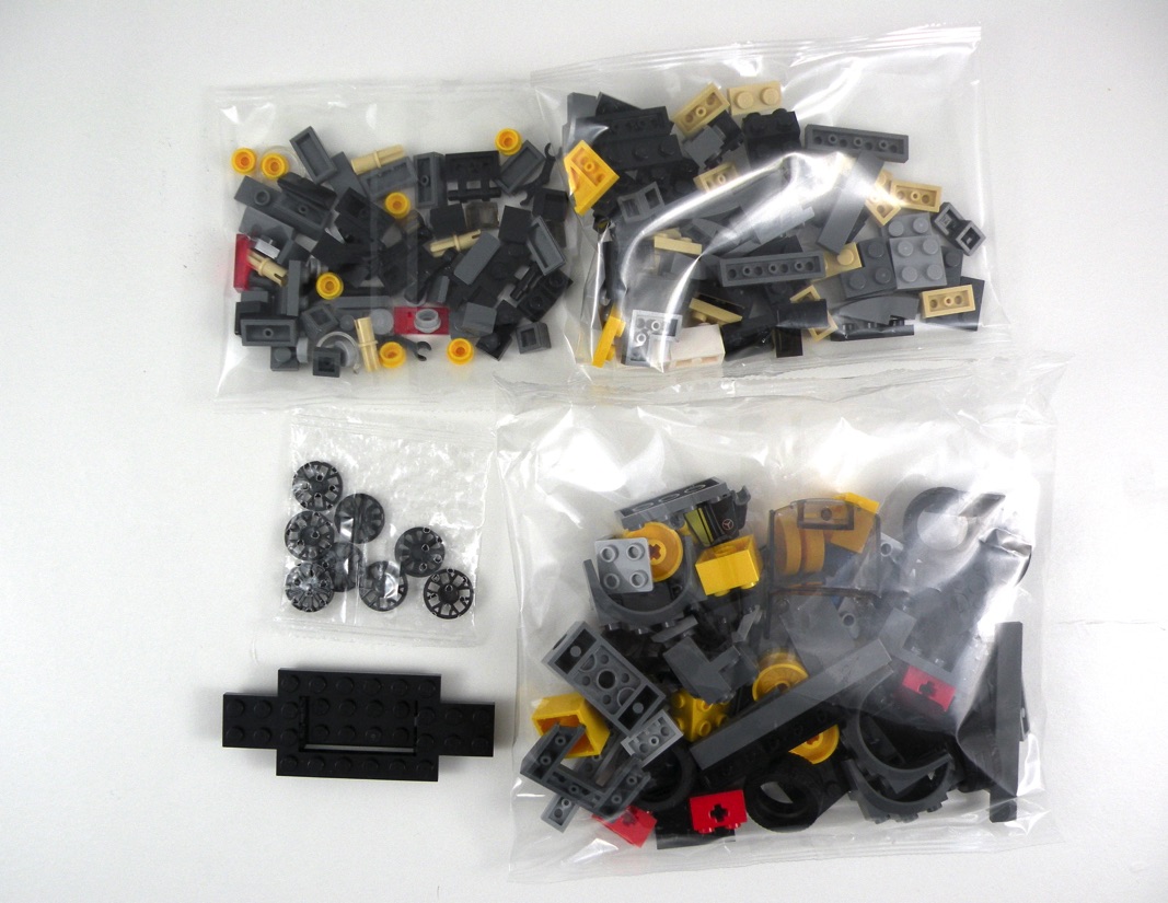 On termine enfin l’assemblage de la version « course » avec la construction de l’aileron et son ajout à la voiture. Là encore, le système de fixation à l’aide de deux Black Arm Mechanical, Battle Droid qui viennent en butée à la fois sur la voiture et sur l’aileron permettent de trouver des angles très intéressants. On ajoute ici les roues, et on notera la présence exclusive (pour le moment) à ce set des jantes de couleur jaune qui, avec les jantes et les pneus noirs, sont du plus bel effet.