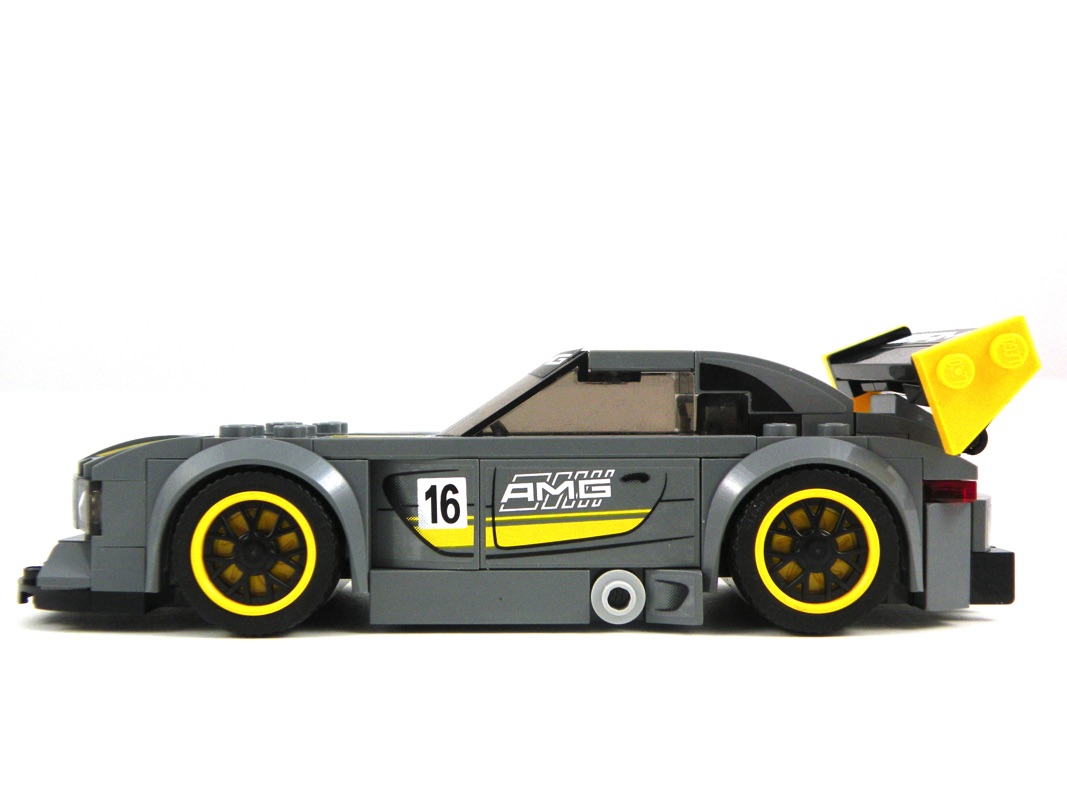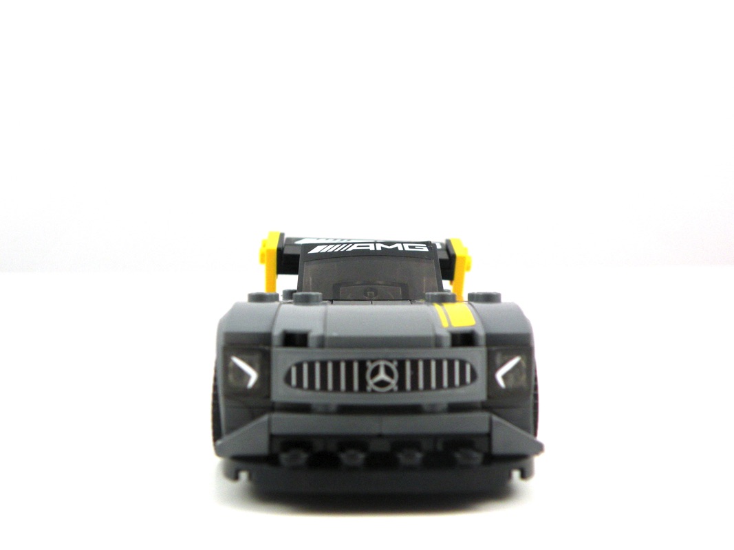 Les courbes sont bien reproduites au vu de l’échelle retenue, on retrouve ce long capot et ce large aileron qui lui donnent vraiment un look d’enfer. On regrette l’utilisation peut-être un peu abusive des autocollants, notamment sur les pièces 1×1 où ils ne sont pas nécessairement justifiés, et sur le pare brise où il est particulièrement difficile à appliquer correctement (une version tampographiée comme celui de la 75872 – Audi R18 E-Tron Quattro aurait été appréciée).