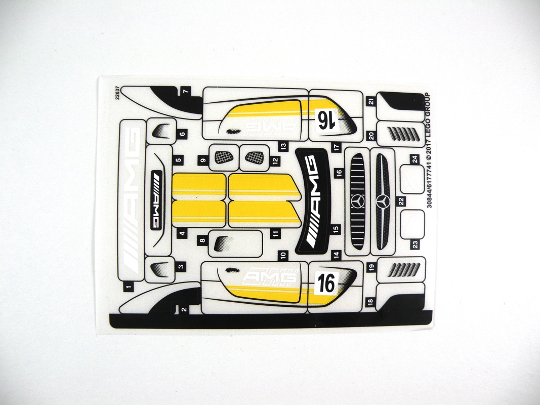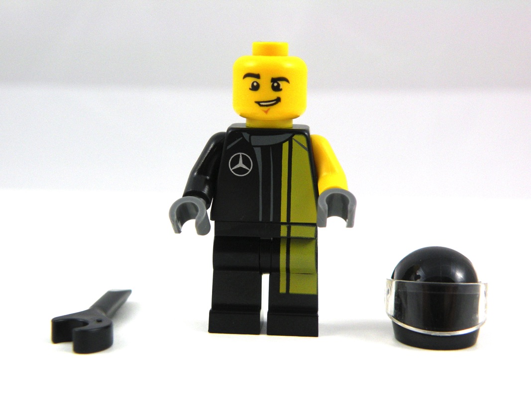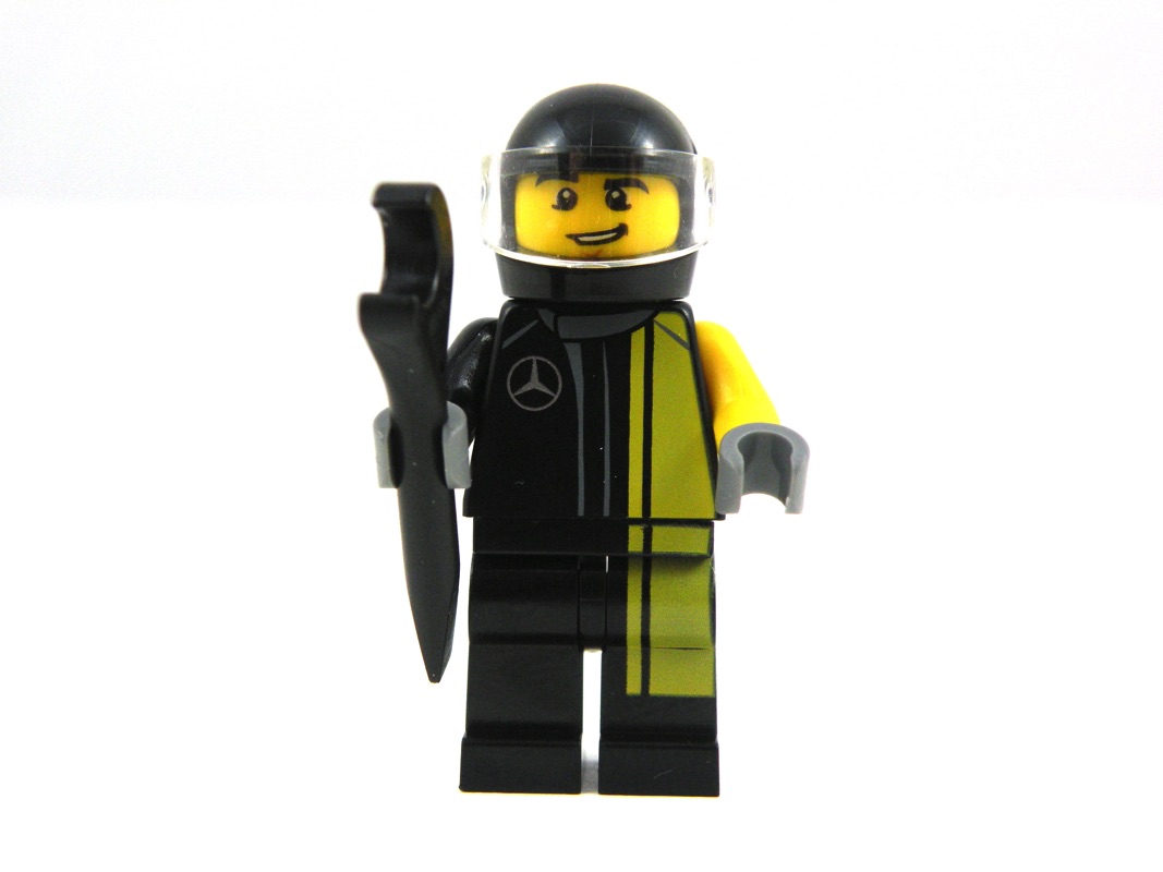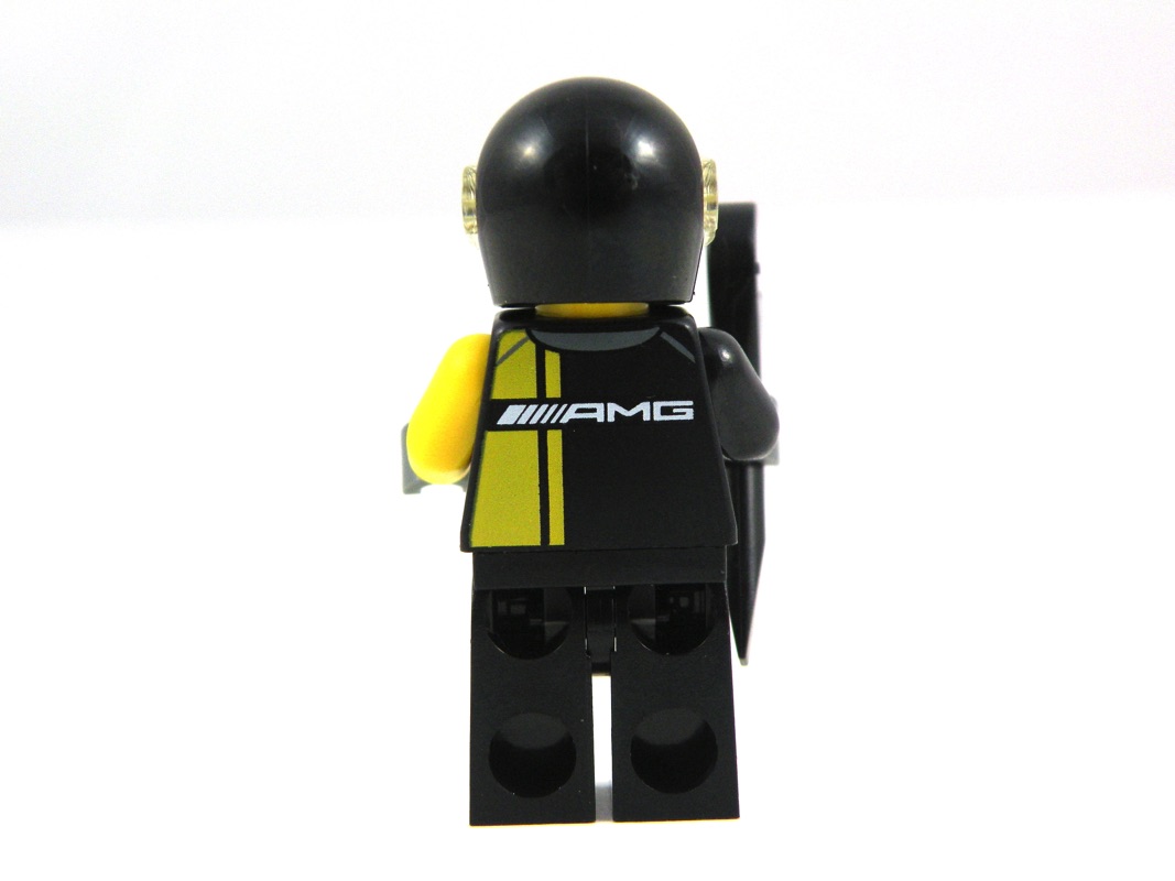 Nous avons ici, comme souvent dans la gamme (mais pas toujours, voir pour la McLaren 720S), le pilote / mécanicien de la voiture, livré avec sa clef plate et son casque. La tête n’est pas exclusive, en revanche le torse et le pantalon son tampographiés avec la tenue de pilote et le logo (Mercedes à l’avant, AMG dans le dos). Malheureusement, comme souvent lors de la tampographie sur des pièces noires, le jaune paraît un peu fade, comparativement au bras gauche (et à la tête) qui est censé être de la même couleur. Les mains sont grises, on peut supposer qu’il porte des gants, et les bras de deux couleurs différentes (jaune et noir). Le casque est noir, sans décor particulier.