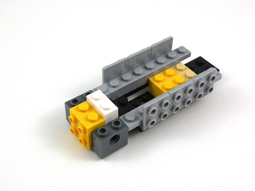 On commence par assembler quelques pièces sur le châssis, puis on s’attaque d’emblée à l’arrière du véhicule. On constate ici une petite astuce bien trouvée pour les feux arrières : les tiles en trans red ne sont fixées que sur l’équivalent d’un tenon, et tournées de quelques degrés en butée contre le châssis. Quelques slopes viennent compléter l’arrière et constituent également la partie arrière du cockpit. Un Black Plate, Modified 1 x 2 with Handle on Side – Free Ends est laissé en attente, de manière à recevoir le futur aileron.