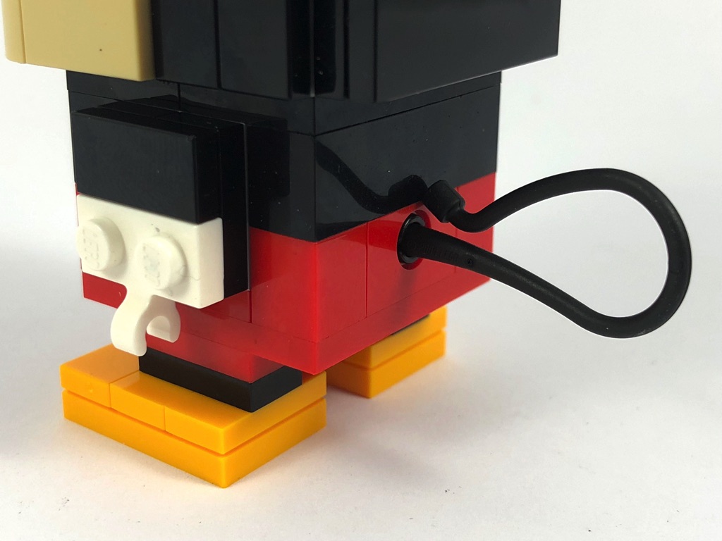 Force est de constater que le designer s’en est plutôt bien sorti. Le design du visage est réussi, même si on regrettera l’absence du grand sourire qui caractérise le personnage. Même si les BrickHeadz n’ont (quasiment) jamais de bouche, je pense qu’elle aurait été bienvenue ici. Les oreilles sont représentées par deux dishs noirs qui conviennent parfaitement. Les joues et le nez sont légèrement décalés en épaisseur grâce à une conception intelligente de la structure du visage, et ça fonctionne bien. Les grands pieds sont bien pensés. Comme je le disais plus haut, j’aurais aimé voir des yeux différents (noirs sur fond blanc).