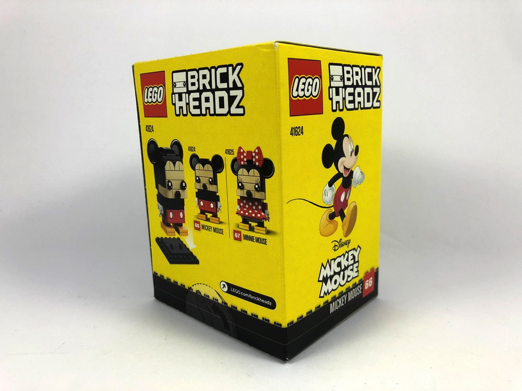 La boîte est au format habituel des BrickHeadz vendues à l’unité. Sur fond jaune, on trouve à l’avant Mickey vu de face, au-dessus de son nom et de son numéro (#66). Dans le coin inférieur gauche, un petit encart nous rappelle que 2018 marque le 90ème anniversaire de la souris. Sur le côté, on trouve le personnage de fiction en train de marcher et au dos, il est présenté aux côtés de sa chérie Minnie Mouse (41625).