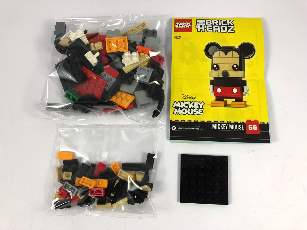 Deux Brick, Modified 1 x 2 x 1 1/3 with Curved Top sont utilisées pour les joues, on habille ensuite les deux côtés et l’arrière de la tête de manière très simple avec quelques tiles. Les jambes sont également différentes de celles vues dans les autres sets de la gamme, ceci afin de représenter les pieds disproportionnés du personnage (ici 3×2 tenons au lieu des 2×1 tenons « traditionnels »). Un fouet fait office de queue, et deux clips tiennent les oreilles en place dans l’emplacement qu’on leur a réservé. On termine en construisant le socle et en posant Mickey sur celui-ci.