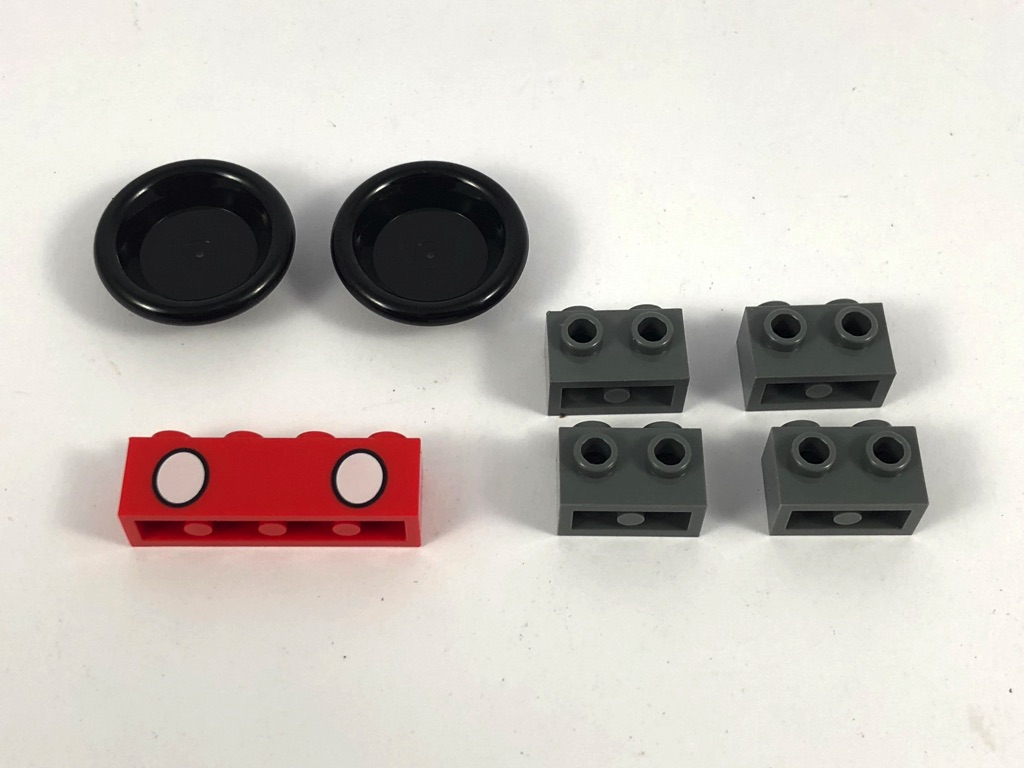 - Une brique rouge tampographiée avec les boutons du short de Mickey