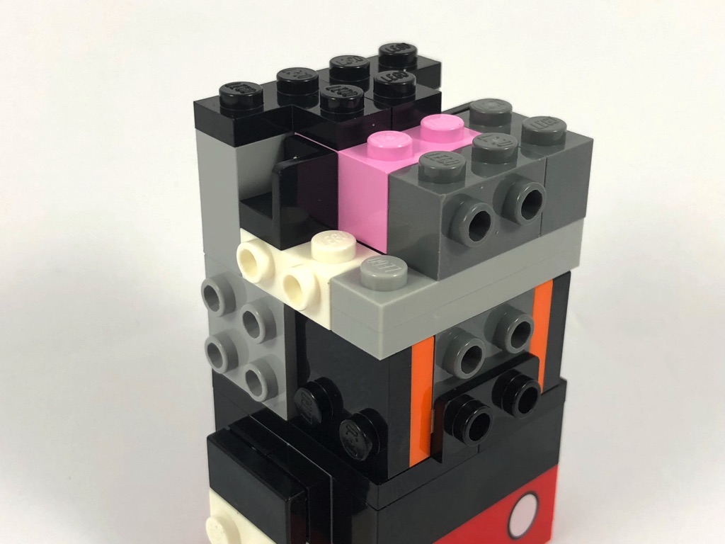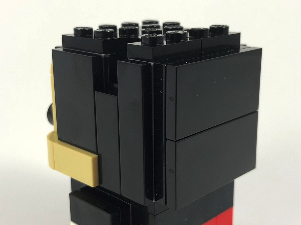 Nous commençons par le torse, tout à fait standard pour une BrickHeadz. Les deux bras ajoutés ensuite le sont également. La structure interne de la tête est en revanche plus intéressante. Alors que la face arrière est constituée des 3 briques SNOT (Studs Not On Top) habituelles, l’avant est réalisé de manière à placer deux joues lisses au même niveau que ces dernières. Le rang de briques situé au-dessus est également différent, pour s’adapter à cette forme particulière, et pour recevoir les oreilles rondes. Deux panels en coin sont ainsi disposés dans la structure.