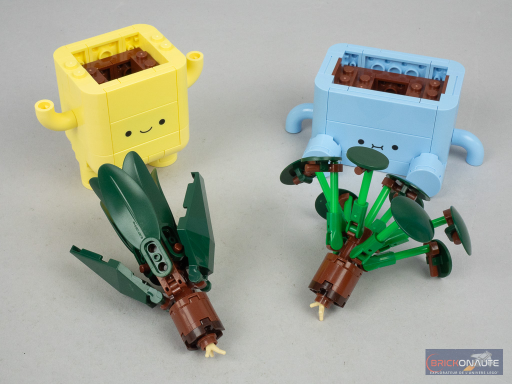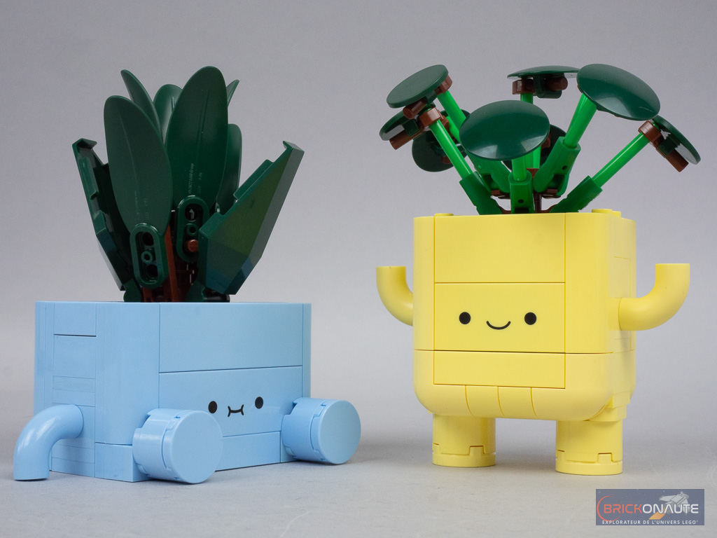 On se retrouve à la fin de l’assemblage avec un set particulièrement mignon, il faut bien l’avouer. Les couleurs sont très sympathiques et pas trop criardes, de sorte que ces deux petites plantes ne jureront pas dans votre décoration d’intérieur – avec leur petite taille, elles s’accommoderont aussi très bien d’un coin de bureau. Je regrette malgré tout quelques écarts de teinte entre les éléments, surtout visibles sous certains angles sur le pot jaune.