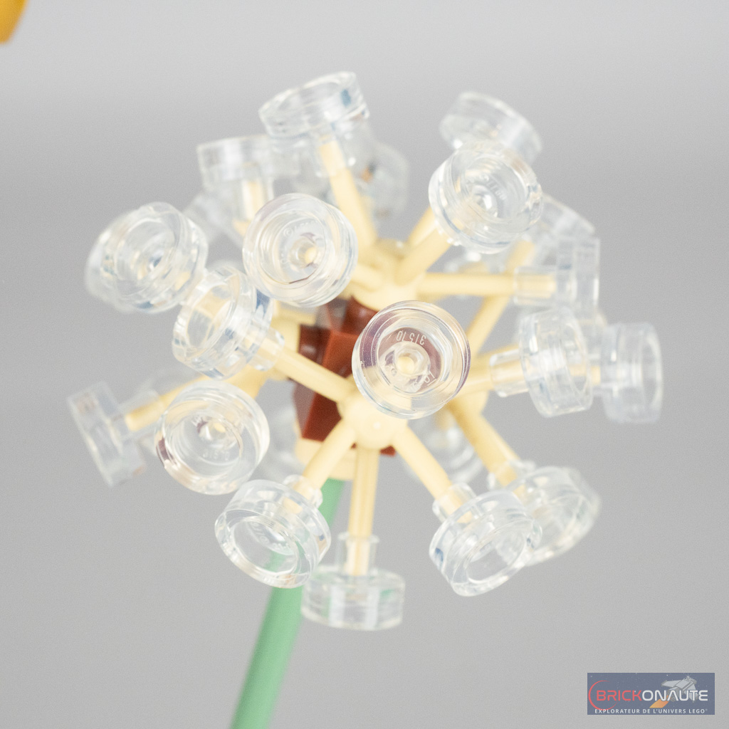 Le pissenlit en fleur utilise de manière astucieuse deux grands engrenages en vis-à-vis, avec le nouvel élément de fleur sur l’extrémité supérieure. Pour le pissenlit fané, ce sont des petites pièces transparentes, qui servent par exemple parfois d’encrier, attachées au bout des pièces à 6 branches employées pour les massifs de fleurs ou les arbres.