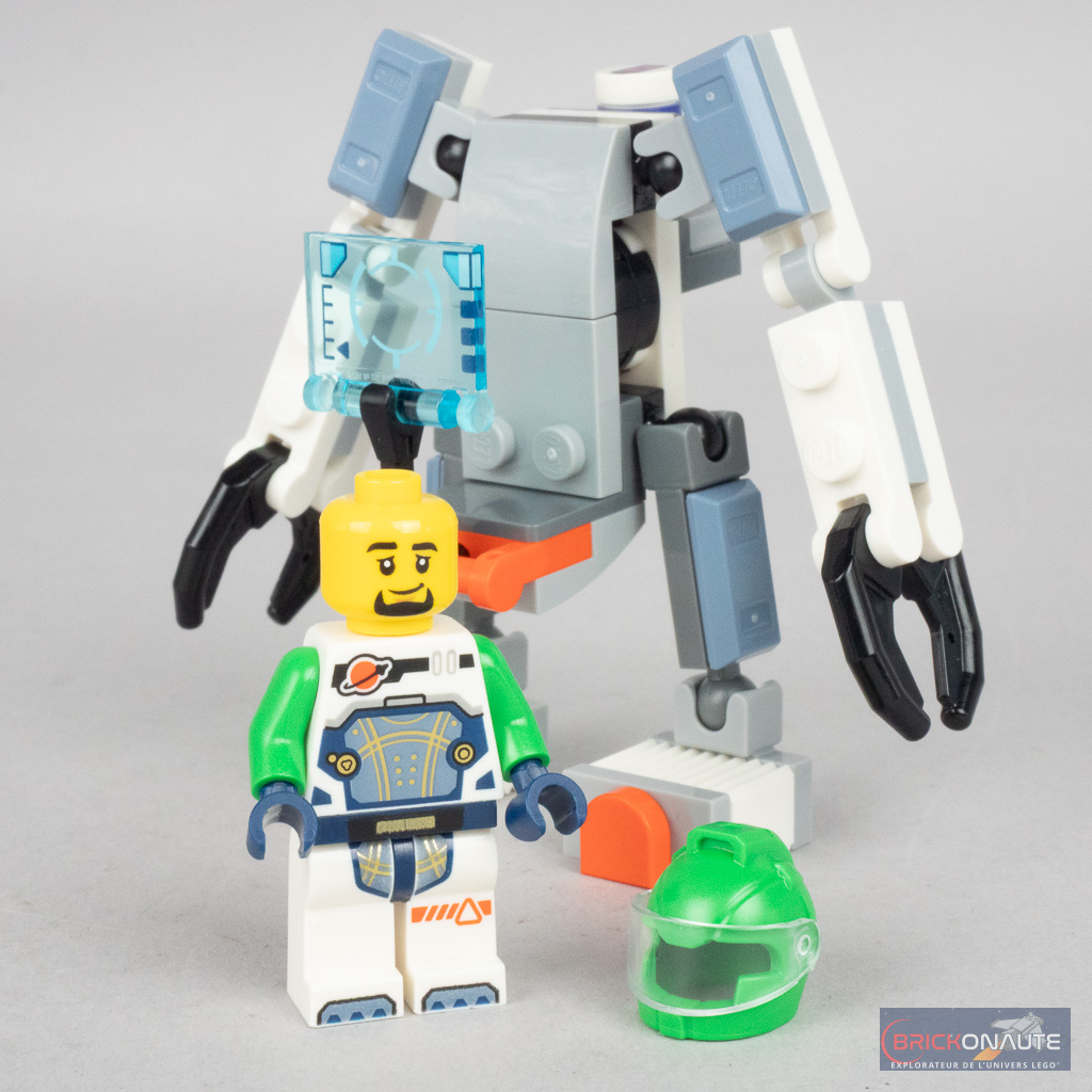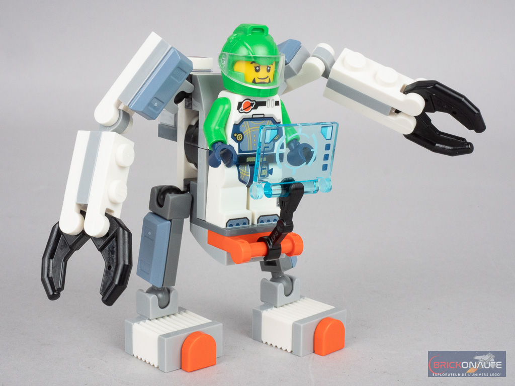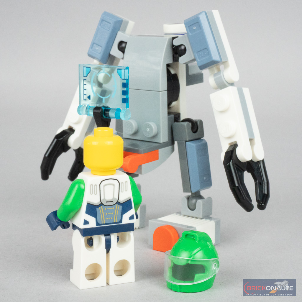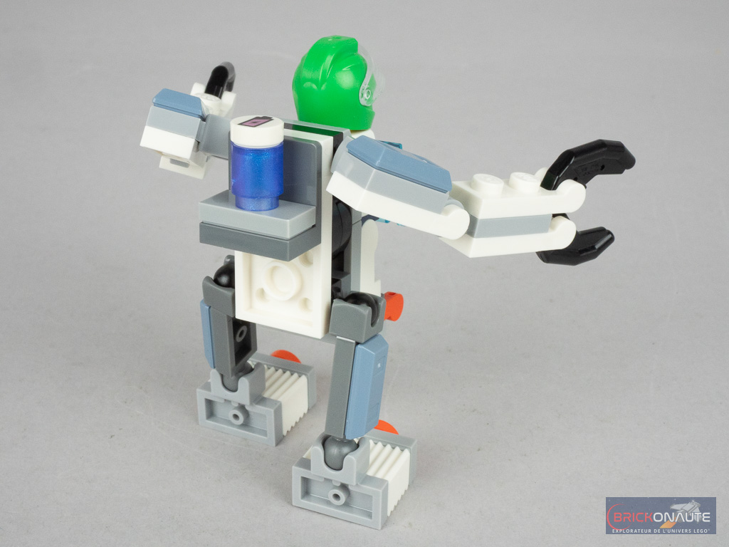 Et il est à mon goût bien plus intéressant que le scooter des mers, avec un inventaire un peu plus conséquent de 49 pièces. Il nous propose, comme son nom l’indique, la construction d’un petit robot, un « mech », avec de nombreuses articulations via des ball joints ou des clips, qui lui permettront de prendre de nombreuses positions. Une petite batterie est attachée dans son dos – remarquez également le bel écran bleu translucide tampographié. Le « torse » dispose de deux tenons pour y installer la minifig fournie.