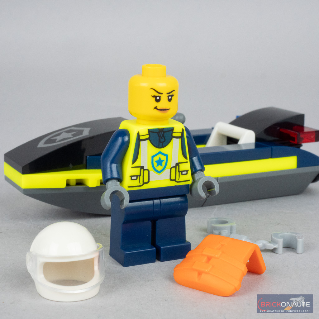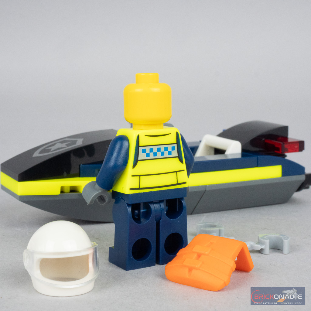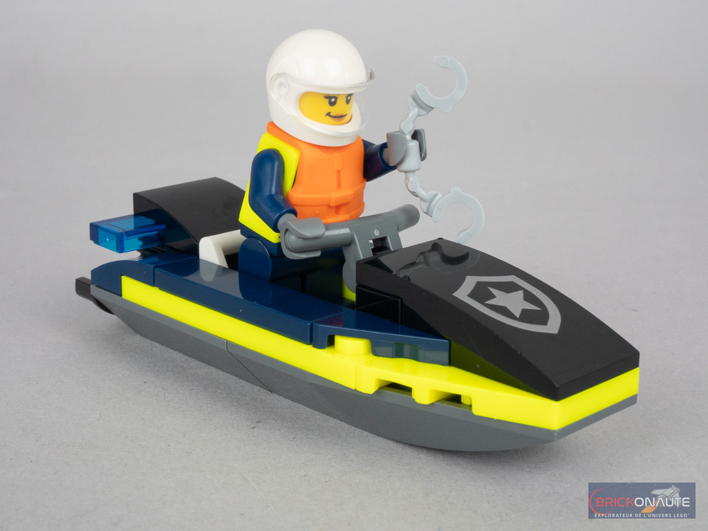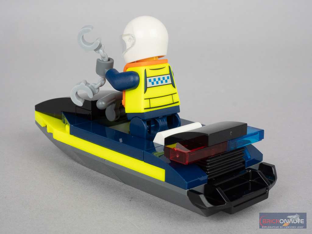 Les détails se limitent au strict nécessaire avec des tiles translucides à l’arrière pour le signal lumineux de la police, un petit aileron au ras de l’eau, un guidon et une slope noire à l’avant tampographiée du logo de la police LEGO City (déjà vu dans d’autres références, dont le très réussi 60462 Helicopter, Fire Truck & Submarine Remix).