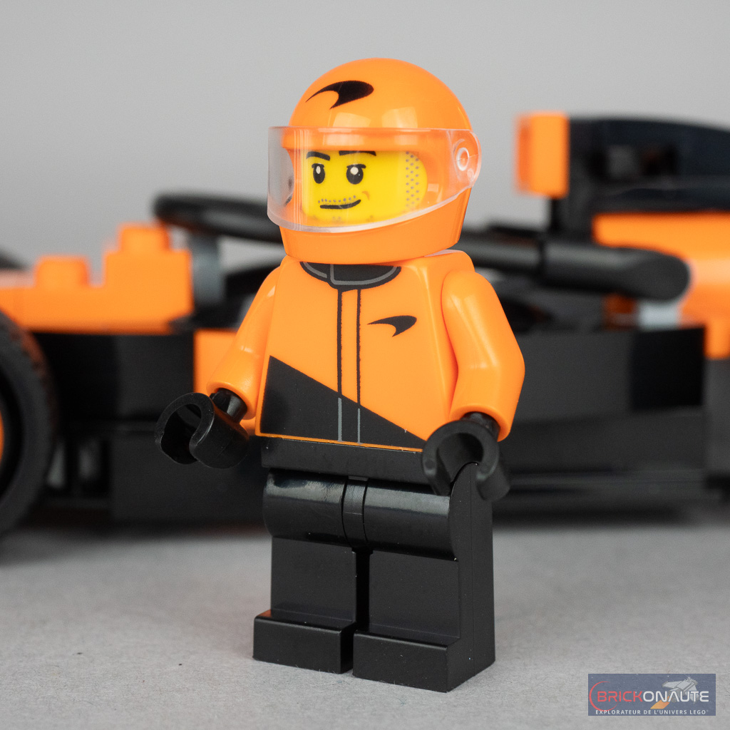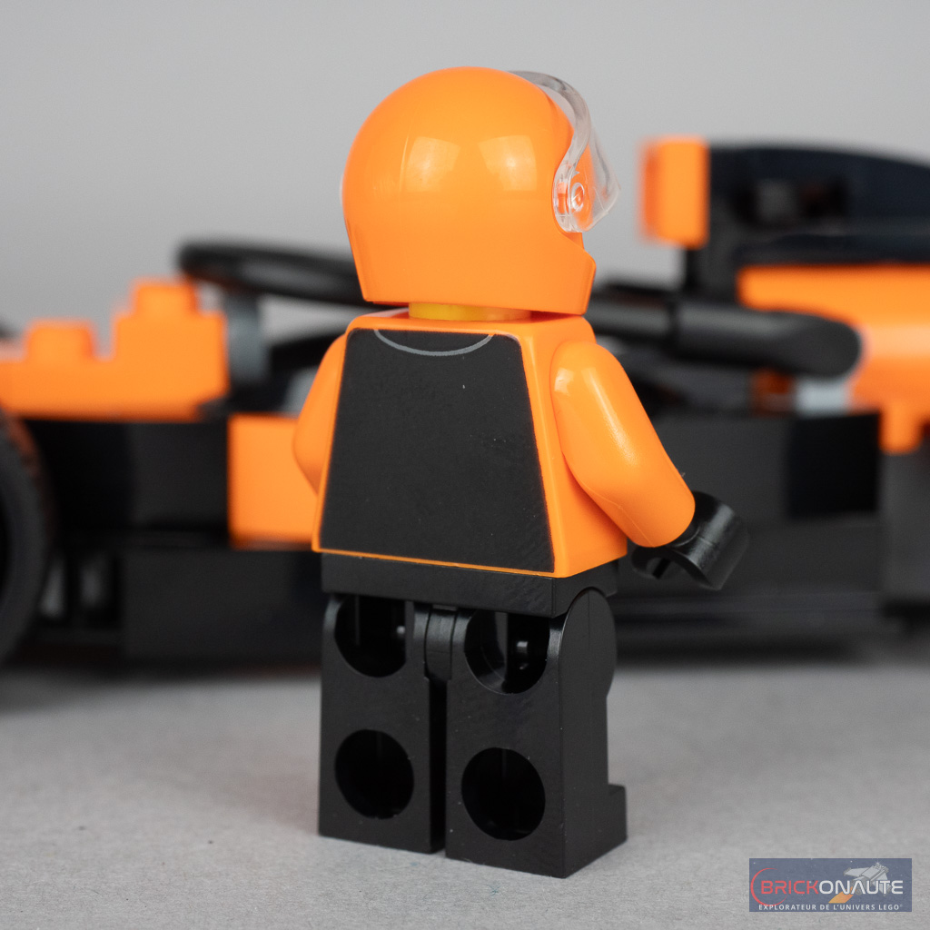 Il n’y a logiquement qu’une seule minifig dans cette boîte, le pilote de la Formule 1 McLaren. Sa conception est simple mais efficace, et surtout suffisante pour l’associer à la marque anglaise : un pantalon noir monochrome et un torse bicolore, orange et noir, avec le logo du constructeur. Logo que l’on retrouve également sur son casque, qu’il partage avec la minifig du set LEGO Speed Champions 76919 2023 McLaren Formula 1 Race Car (245 pièces – 26,99 €) sorti le 1er mars 2024. La tête est volontairement générique, de sorte que le personnage ne soit associé à aucun des véritables pilotes.