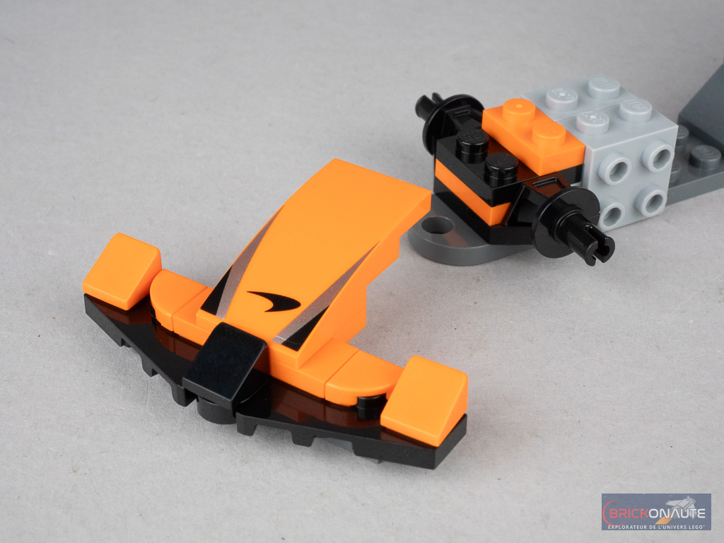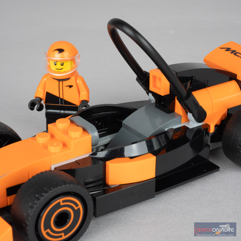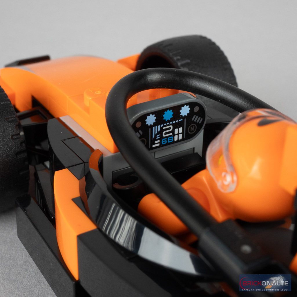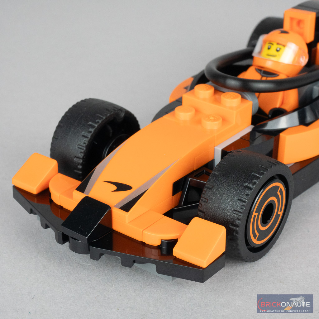Il ne démérite pas non plus, loin de là, reprenant tous les éléments qui font de la voiture une Formule 1 avec ses ailerons, ses roues exposées, sa forme si particulière de l’arrière, son halo et même le petit volant tampographié. Le schéma de couleurs retenu et les deux petits logos tampographiés l’identifient au premier coup d’oeil comme une voiture McLaren.