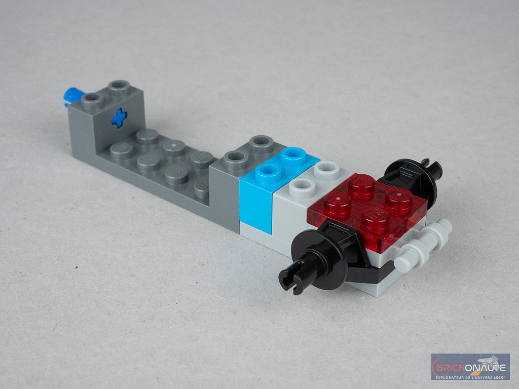 L’assemblage est bouclé en une dizaine de minutes et, chose appréciable, l’intégralité des pièces décorées est tampographiée (le nez, l’aileron, et l’intérieur des roues) – il n’y a pas le moindre autocollant dans cette boîte. Tant mieux pour un set destiné aux plus jeunes, portant la mention « 6+ ». Si la construction est courte, elle est loin d’être inintéressante avec des éléments spéciaux pour les essieux, une conception arrière bien pensée à base de slopes et de demi-cylindres, et des passages de roues placés à l’horizontale pour former l’habitacle. Le halo est constitué d’une tige souple articulée sur deux clips, qu’il faudra soulever pour placer la minifig aux commandes.