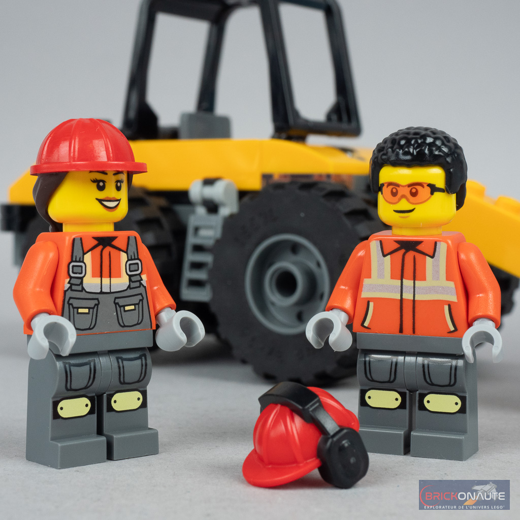 Car oui, LEGO a fait l’effort de fournir deux personnages dans cette boîte, un homme et une femme, en tenues de chantier. Cerise sur le gâteau, les deux torses (différents) et les deux paires de jambes sont pour le moment inédites et exclusives à cette boîte ! Les deux personnages portent un pantalon de travail avec deux poches et une veste fluo, celle du personnage féminin étant couverte par le haut de sa salopette. La tampographie est très propre, chapeau bas sur ce point.