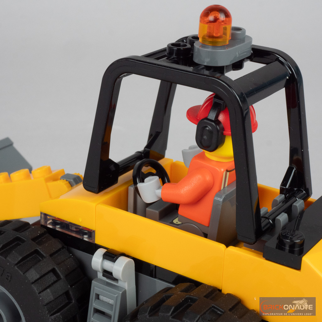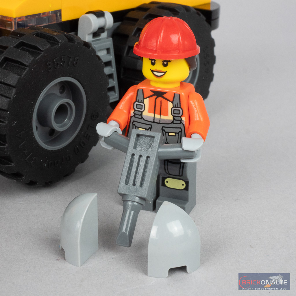 Quelques accessoires sont fournis pour agrémenter un peu la jouabilité, avec des pièces en vrac prévues pour être ramassées et transportées par la chargeuse. On trouve aussi un petit panneau avec un logo « travailleur », 3 cônes oranges pour délimiter le chantier, et un marteau-piqueur pour mettre la seconde minifig au travail.