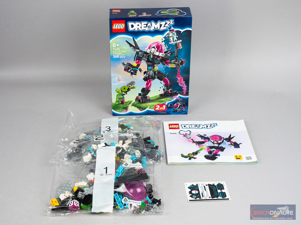Dans la petite boîte, on trouve 3 sachets de pièces numérotés, une planche de 11 autocollants et la notice d’instructions. Comme dans les autres sets de la gamme LEGO DREAMZzz, celle-ci est découpée en 3 sections : la première servant à la construction du « tronc commun », et les deux suivantes pour l’assemblage du modèle choisi. Et il s’agit ici de choisir entre le robot Cyber cerveau ou le robot scorpion Cyber cerveau – j’ai choisi la première option.