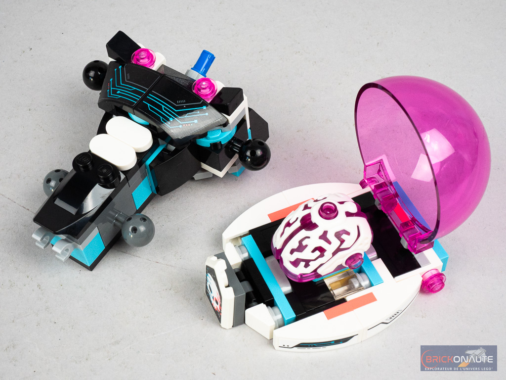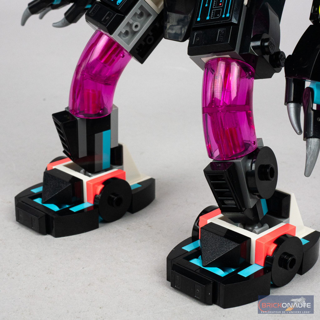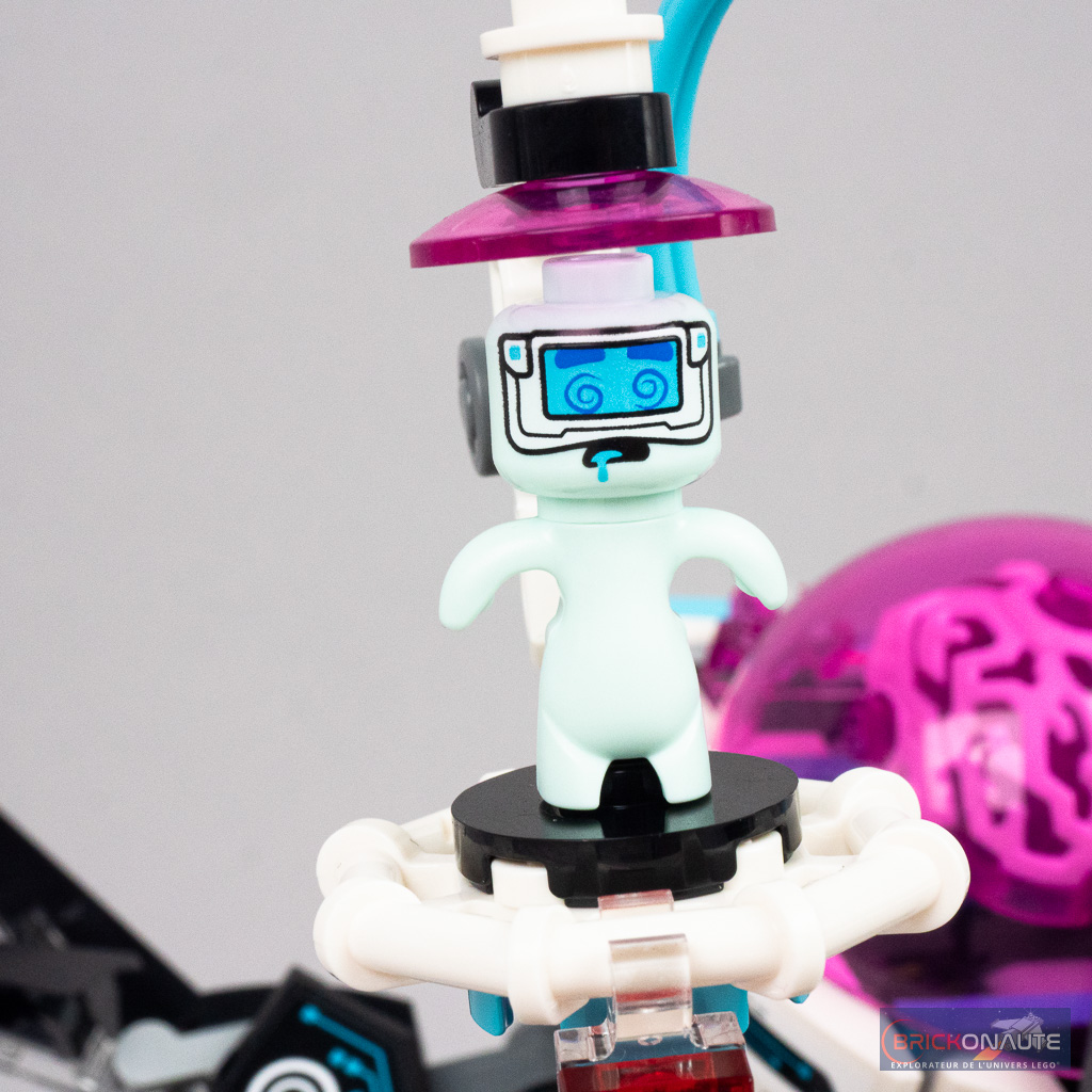 Le look du robot est plutôt cool, presque un peu creepy avec ce cerveau encapsulé sous son dôme rose. Je trouve que le mélange de couleurs noir / violet translucide, plutôt courant dans la gamme LEGO DREAMZzz, fonctionne toujours aussi bien. Il ne faut cependant pas regarder les détails de trop près, ça reste un jouet dédié aux plus jeunes. Et pour une fois, les joints gris savent se faire (à peu près) discrets au milieu de tout ce noir. Il faudra malheureusement passer par l’application de quelques autocollants, au design plutôt réussi soit dit en passant.