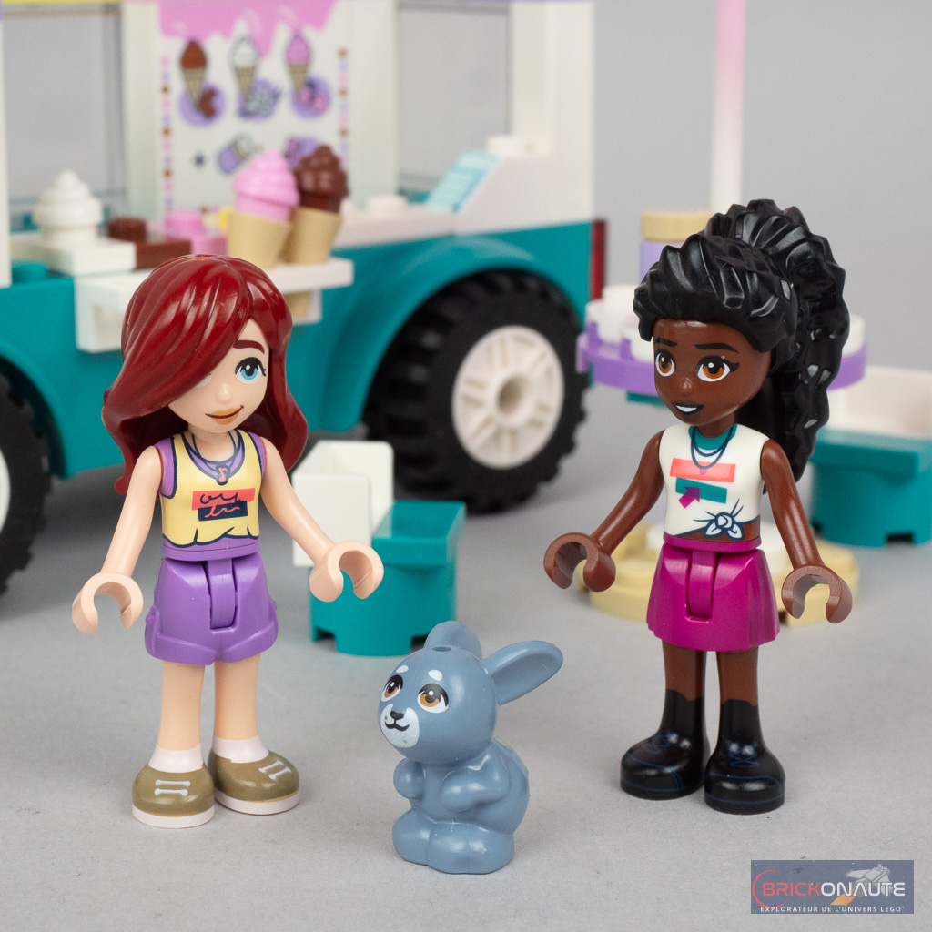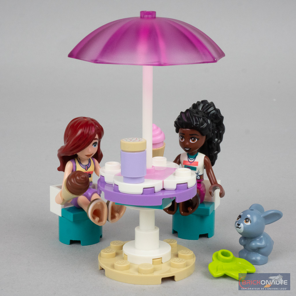 En plus du camion de glaces, LEGO nous propose également dans cette boîte une petite table avec un parasol et deux fauteuils. On pourra y installer les deux minidolls fournies, Paisley et Elsa D, qui pourront tranquillement discuter un cornet à la main sous le soleil d’Heartlake City.