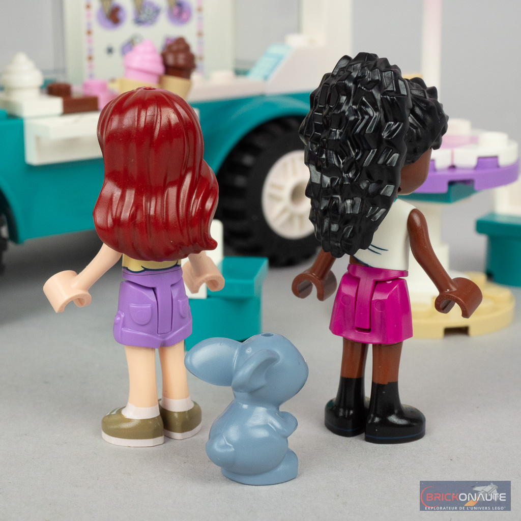 Paisley nous est proposée dans une tenue plutôt commune avec son débardeur jaune – son short fait en revanche sa première apparition dans cette boîte. Elsa D est un tout nouveau personnage, totalement inédit, et je dois bien avouer que j’adore son immense chevelure, qui a malgré tout un petit désavantage : plutôt lourde, elle a tendance à déséquilibrer un peu la minidoll. La tampographie de son torse est également très jolie avec un débardeur blanc noué au niveau du ventre. Et puisqu’il faut toujours un ou plusieurs animaux dans un set LEGO Friends, les deux protagonistes sont accompagnées du lapin Melody.