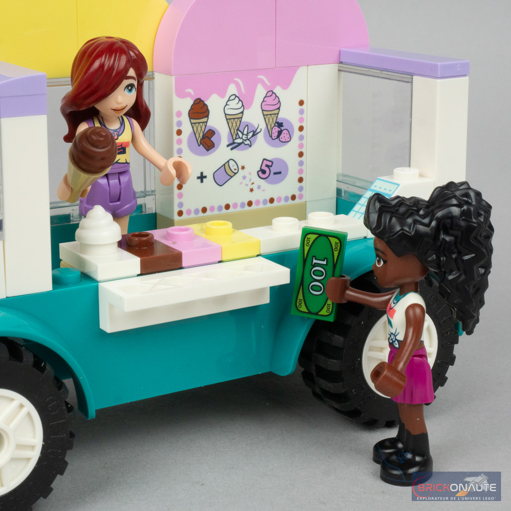 Évidemment, avec une construction aussi simple de moins de 100 pièces, le design obtenu est tout aussi simple avec un camion aux formes très carrées sans toit au-dessus de la zone de service. On devine malgré tout au premier coup d’oeil qu’il s’agit d’un glacier grâce aux boules de glace géantes sur le fond, au menu, et aux bacs présents sur le comptoir. À ce sujet d’ailleurs, il manque malheureusement un parfum parmi les 4 : il n’y a pas de boule de glace jaune à mettre dans un cornet.