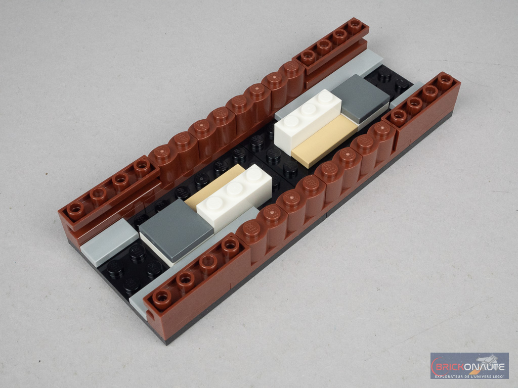 Pour se livrer à ces duels, LEGO propose dans cette boîte deux baguettes (et deux en rab) avec une extrémité prévue pour attacher un « sort ». Cet élément, introduit en 2023, reste relativement rare et c’est même sa première apparition en dark brown. Pour les autres éléments notables de cette boîte, on remarquera évidemment les éléments tampographiés avec les motifs de la piste de duel, très fidèles aux motifs vus dans le film – même si la piste est nettement moins longue ici.