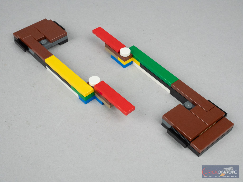 La construction est bouclée en une dizaine de minutes, montre en main. La partie la plus intéressante est évidemment le système « d’éjection » : les minifigs sont placées sur des plateformes, attachées par un simple clip au reste de la construction. Deux sous-ensembles mobiles et actionnables depuis les extrémités glissent à l’intérieur de la structure et rencontrent ces petites plateformes, une pression suffisante permet alors d’éjecter la plateforme opposée. C’est robuste et efficace, le perdant du duel fait un beau vol plané.