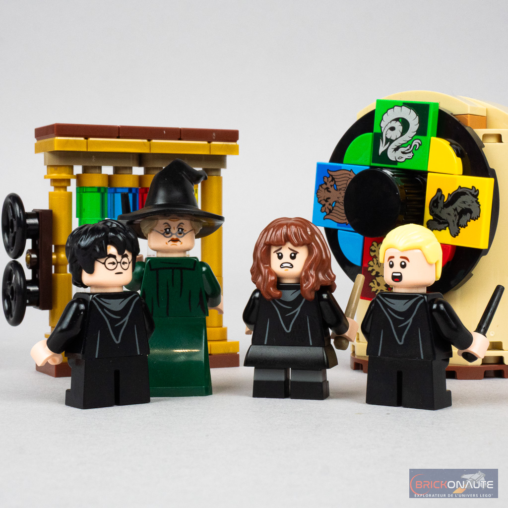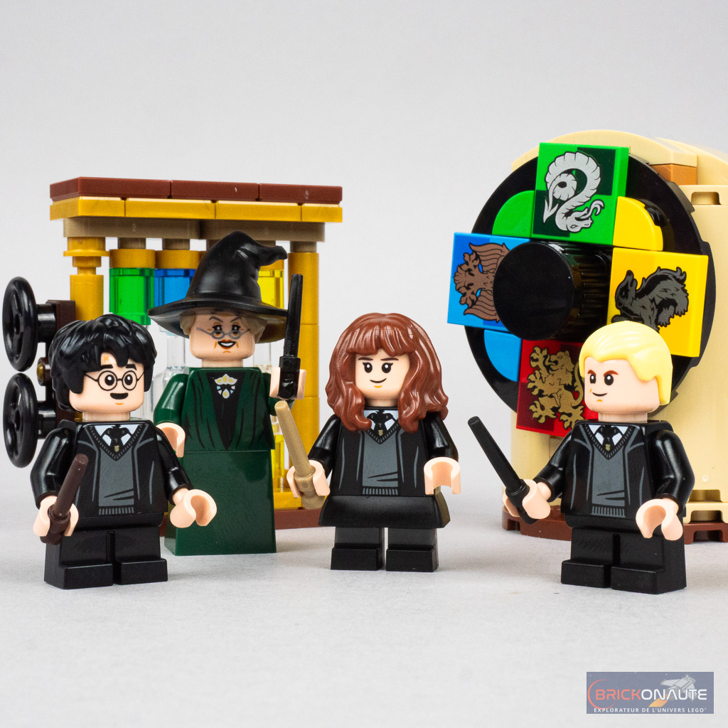 Du côté des minifigs, on trouve Harry Potter, Hermione Granger et Draco Malfoy, tous fournis avec un torse générique sans blason plutôt courant dans la gamme. Seul élément inédit à noter, la tête de Draco. Notez que tous les personnages ont le droit à un double visage. Il aurait été intéressant que LEGO nous propose un personnage de chaque Maison mais bon, il faudra faire avec. D’autant que 4 minifigs dans une boîte à 15 €, c’est rare.