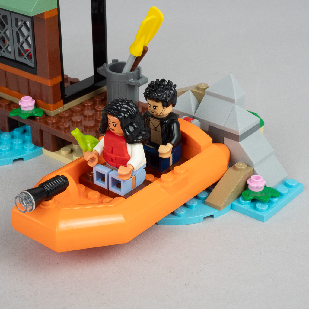 On se retrouve avec deux véhicules, un petit quad (avec deux places) et un bateau pouvant également accueillir les deux minifigs pour qu’elles puissent échapper au vilain tyrannosaure. C’est logiquement assez simple dan la conception, mais ça fait le taf et la présence de deux moyens de transport permettra de multiplier les histoires.
