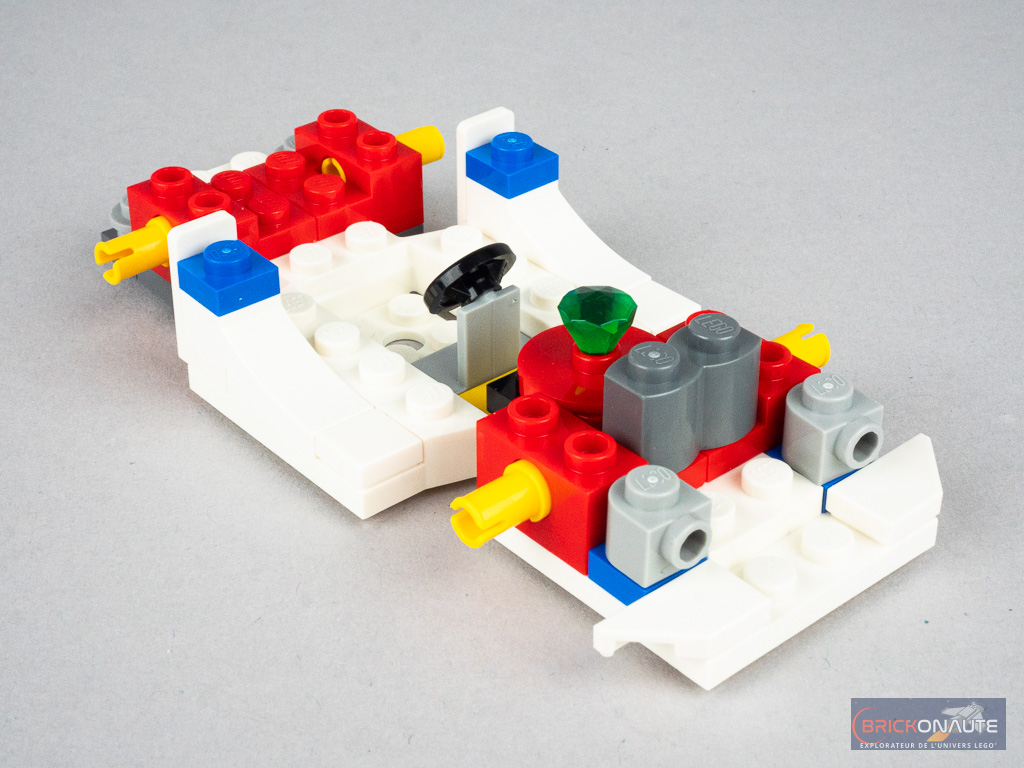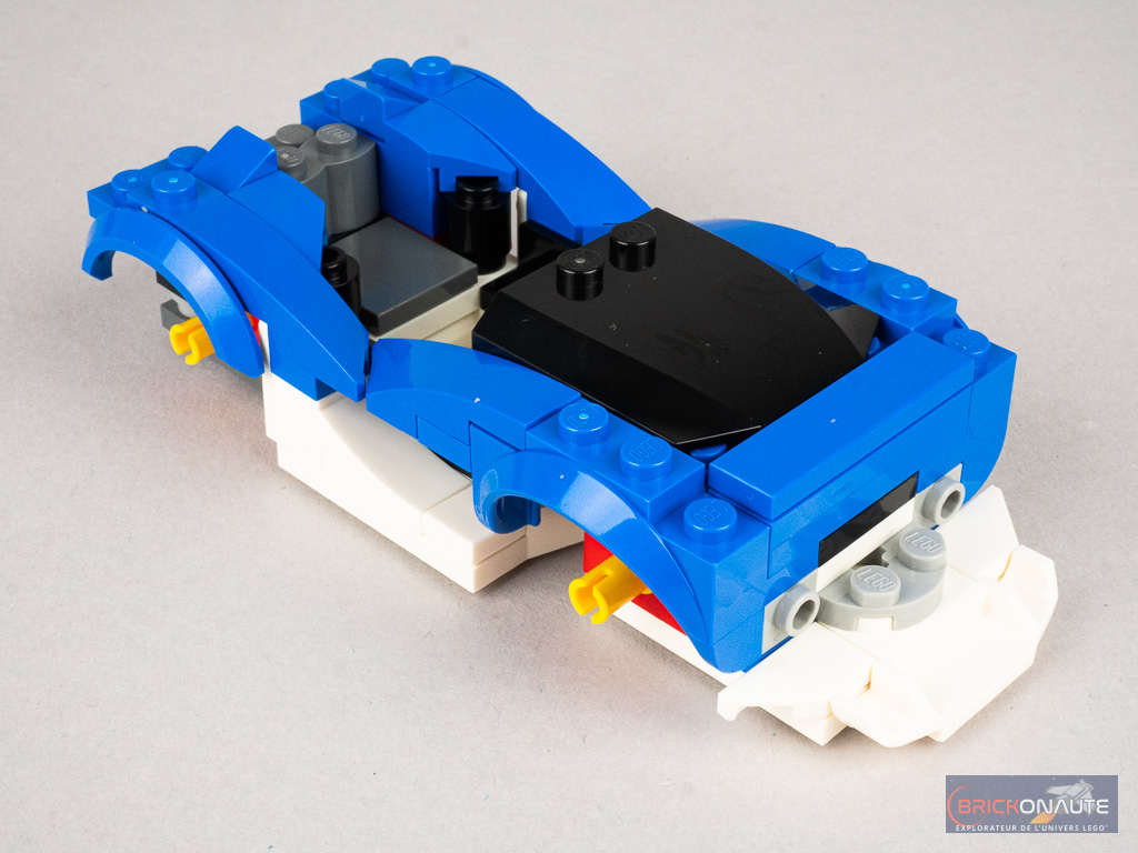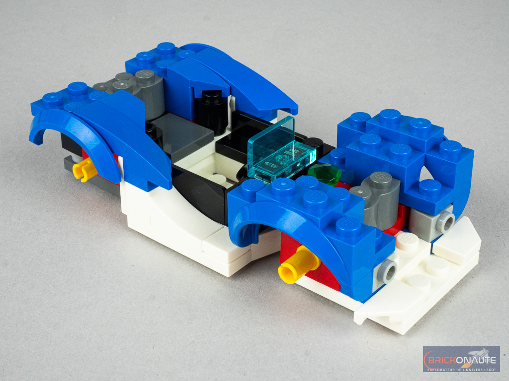 Le résultat final me semble honnête avec une voiture bicolore, un joli travail de l’avant et l’arrière pour une petite voiture comme celle-ci (il n’y a pas d’autocollants, et les optiques sont brick-built) – j’aime beaucoup également les deux côtés du véhicule avec cette forme courbe en renfoncement. Notez que LEGO fournit quelques anneaux pour mettre le bolide en situation.