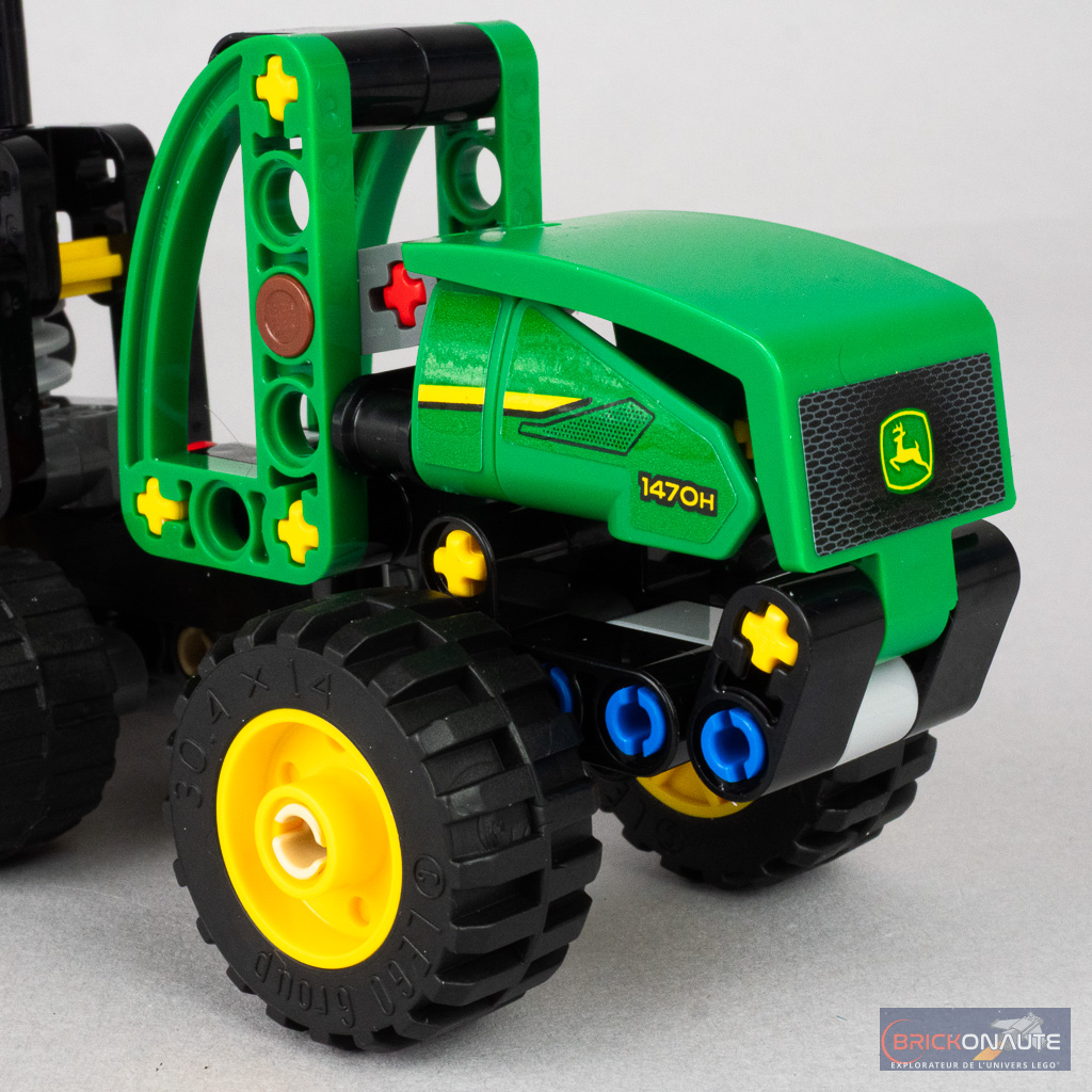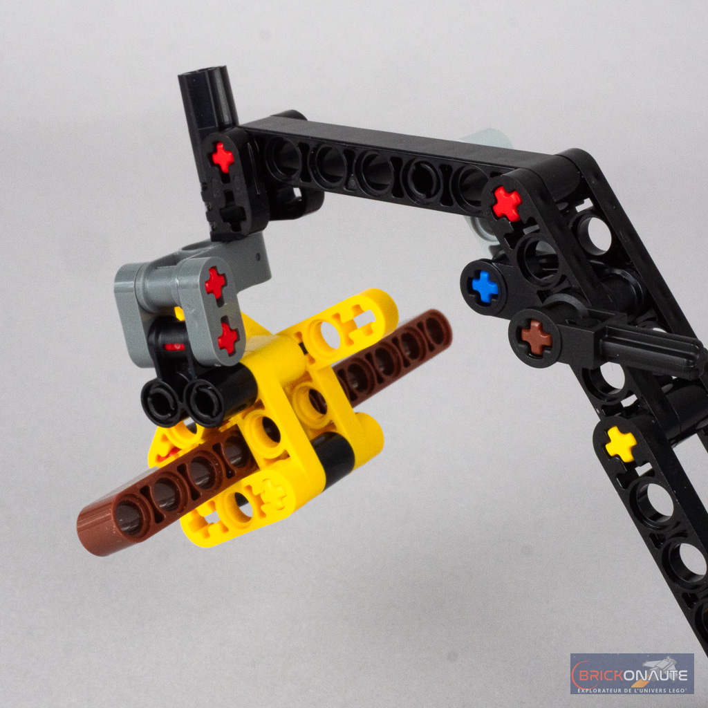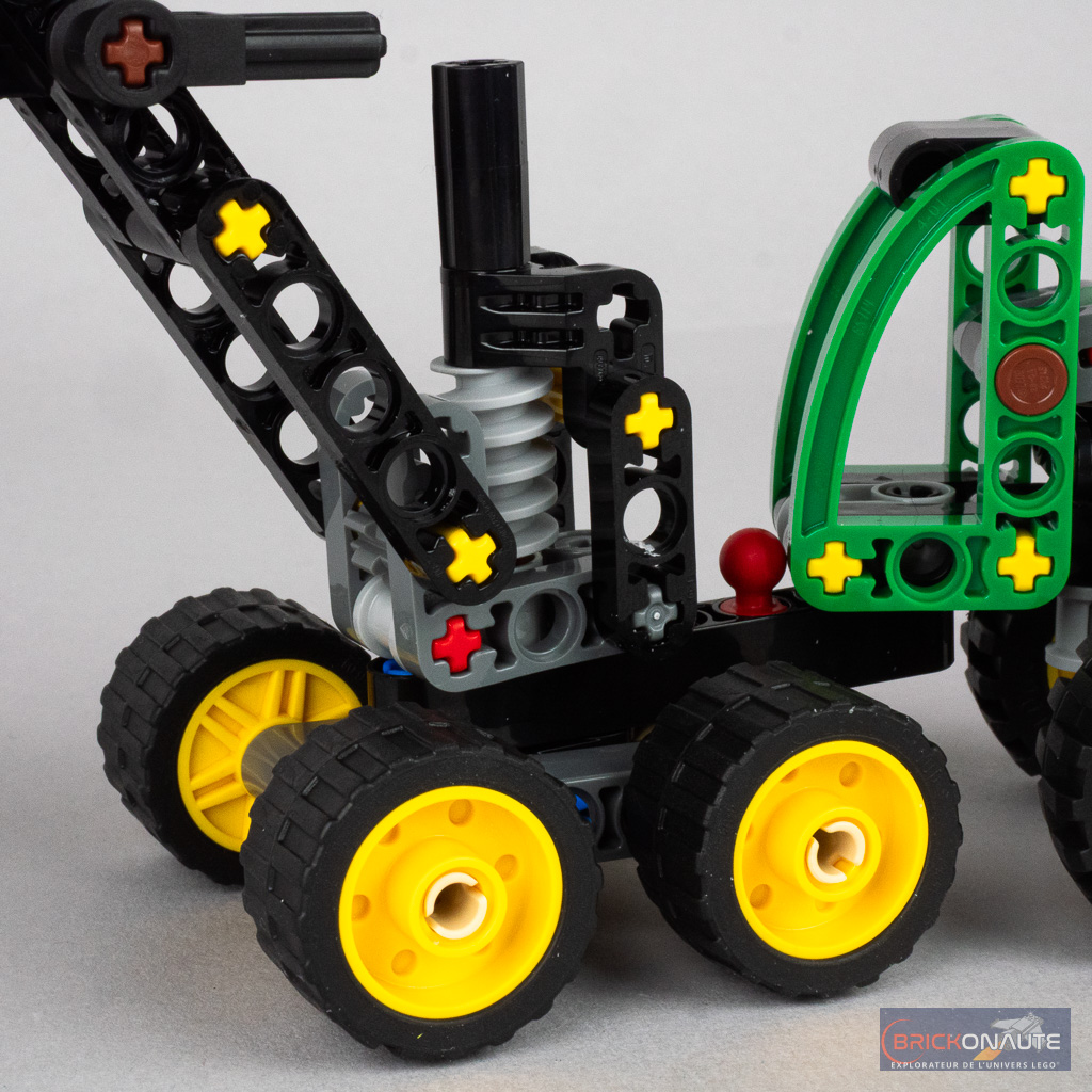 Pour une petite boîte à 10 €, on appréciera les nombreuses fonctions même si leur intégration est discutable sur le plan du design. Hormis l’articulation cabine / train avant que j’évoque plus haut, les 4 roues avant sont articulées sur des beams indépendants et peuvent donc franchir d’éventuels obstacles. La partie basse du bras est mise en mouvement par une vis sans fin et un petit levier actionne la deuxième partie de ce bras, terminé par une pince qui peut tourner sur elle-même, à fermer manuellement. LEGO fournit également un beam supplémentaire en guise de tronc à manipuler avec la machine.