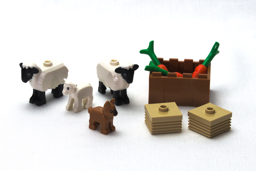 A l’intérieur de la boite, on trouve deux sachets en plastique numérotés, deux notices, ainsi qu’un châssis en vrac. L’inventaire, disponible ici, nous offre quelques animaux plutôt rares avec deux moutons, un agneau et un chiot. Le torse du fermier est apparu dans le grand 21353 The Botanical Garden. La fille porte une chemise à carreaux qui semble être une nouveauté exclusive. Il n’y a pas d’autocollants dans les sets 4+, donc la tile 2×2 avec la calandre est bien tampographiée. La taille du set limite les métapièces au seul châssis.