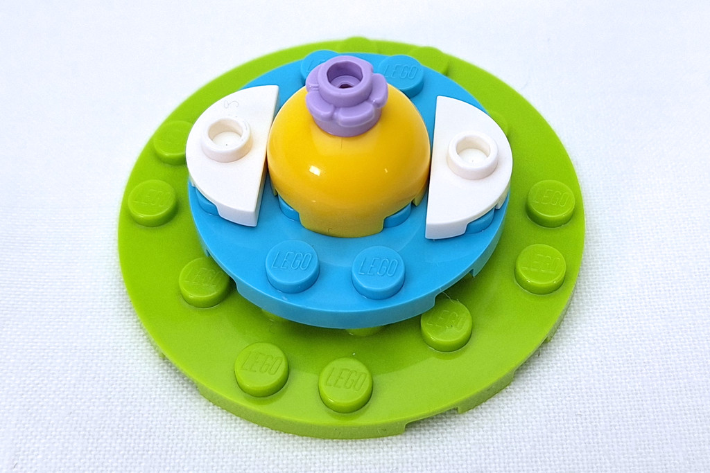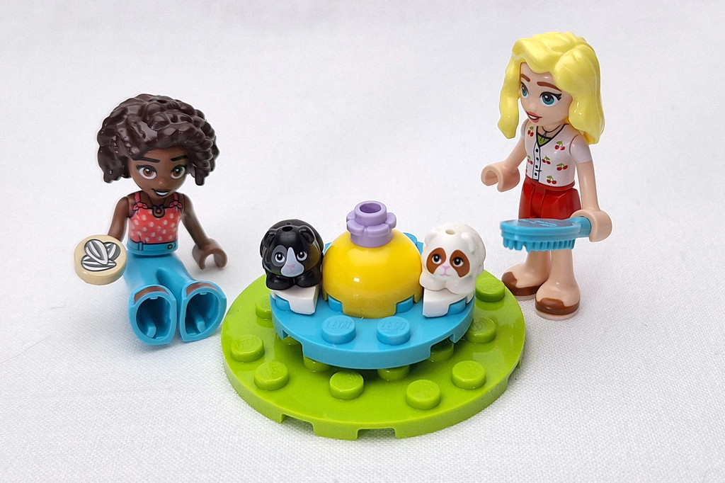 La petite boite met en scène nos amies Mathilde et Aliya dans une aire de jeux extérieure et prévue pour leurs cochons d’Inde, Ruby et Lucky. Il y a également un petit tourniquet. A l’intérieur du set, on trouve deux sachets plastiques, deux plaques en vrac, et une notice. Pas d’autocollants, les round tiles 1×1 sont tampographiées de graines de tournesol. Dans le petit inventaire, on a quelques éléments dans de nouveaux coloris, ainsi que deux nouveaux éléments de cette année : la pelote de laine et le cochon d’Inde.
