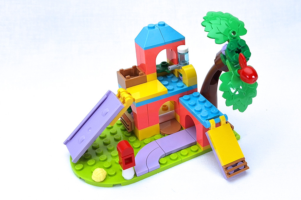 La construction de l’aire de jeux est réglée en moins de dix minutes et se fait très facilement sans techniques particulières. Je ne vais pas détailler la construction que vous pourrez retrouver dans les photos. L’ensemble est compact et très coloré, ce qui tranche avec la présence du petit pommier et son unique pomme. Les cochons d’Inde ont un espace pour boire et manger, un autre pour dormir, et enfin des toboggans pour le jeu. Sans oublier à côté un petit tourniquet avec deux places.