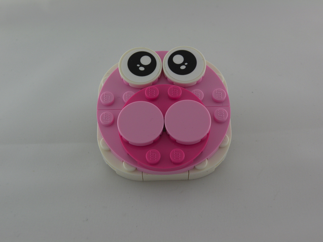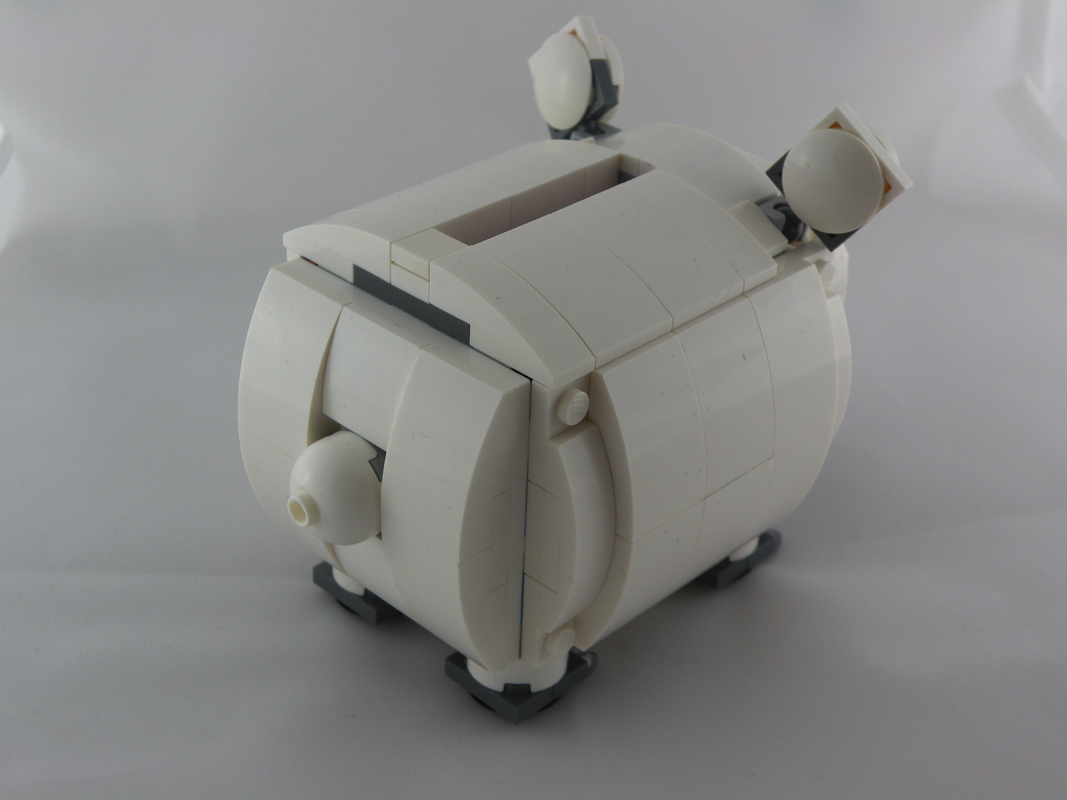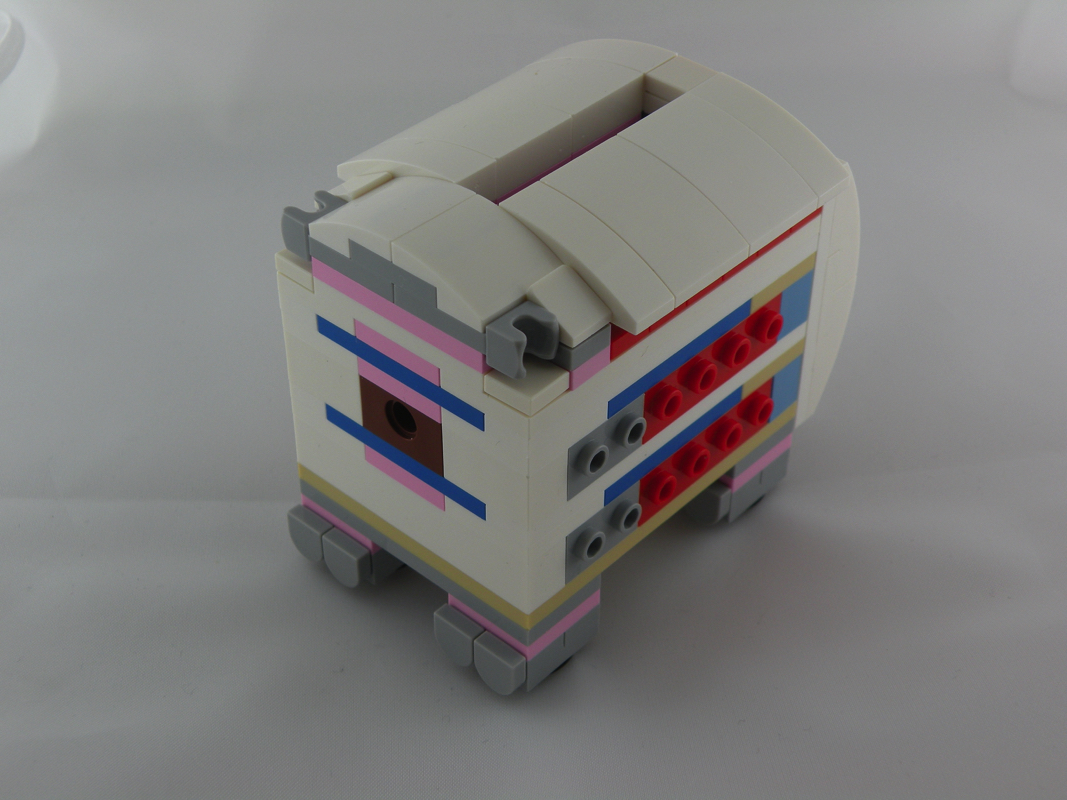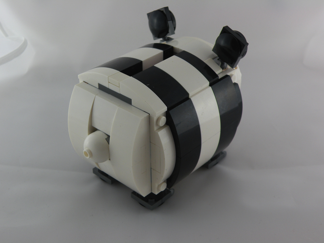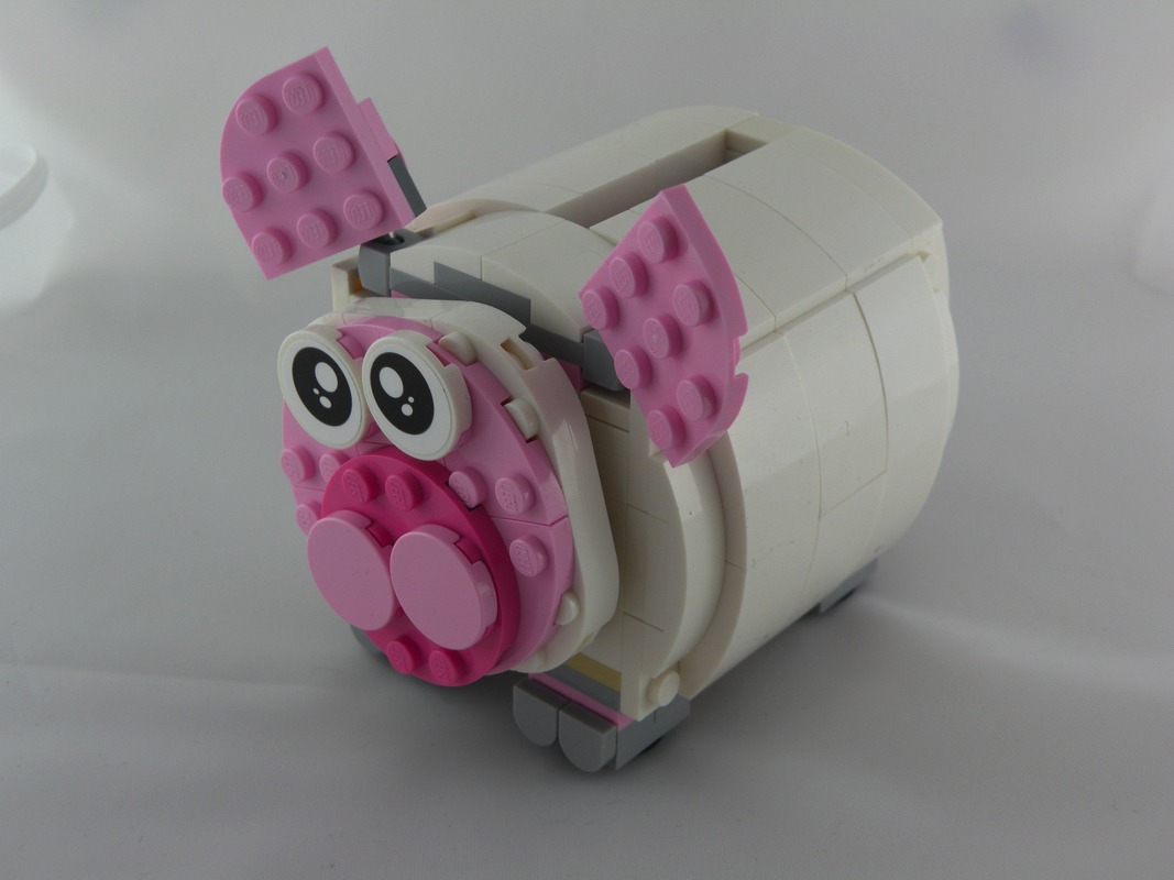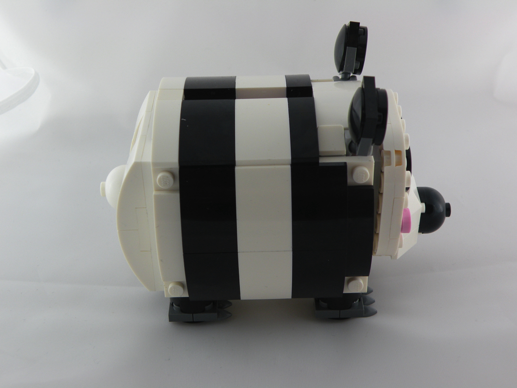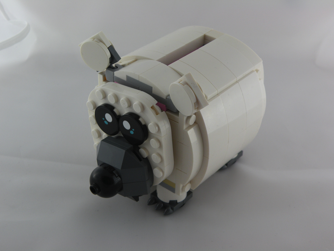 Une adaptation assez simple une fois le cochon construit. Corps blanc monochrome également, visage blanc, dark bluish gray et noir, et les oreilles blanches. Peut-être le modèle le moins réussi des trois, du moins à mon goût.