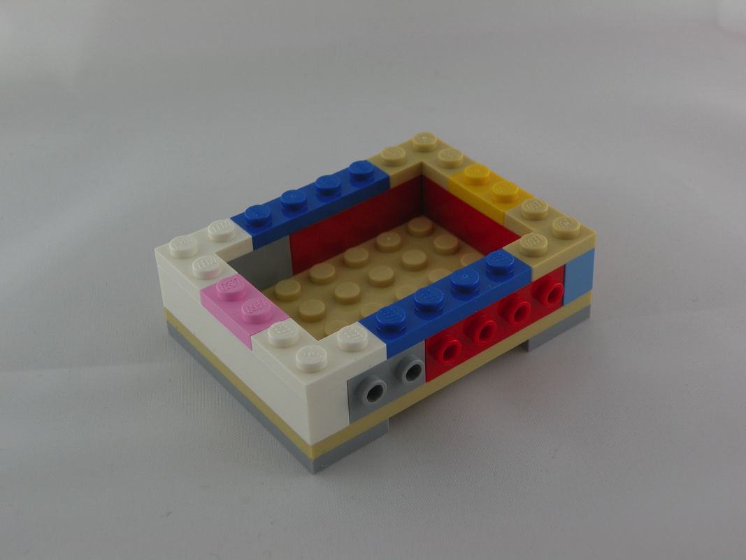 On commence par assembler le tronc, qui est commun aux trois animaux. Il sera ainsi assez aisé de passer de l’un à l’autre, la « conversion » ne prenant que quelques minutes. Un assemblage assez simple, sur une plate de 8×6 tenons, des tenons apparents sur les côtés afin de pouvoir assembler les flancs et l’arrière des animaux, et une pièce Technic qui elle accueillera la tête de ceux-ci. La tête des animaux est donc orientable.