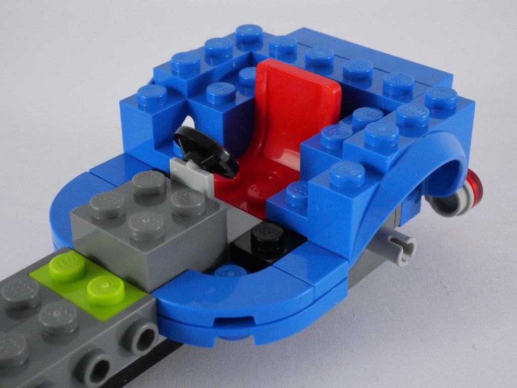 La construction prend une vingtaine de minutes et est plutôt intéressante. On commence par le châssis et les deux essieux, avant de s’intéresser à l’arrière de la voiture. On y ajoute les feux et la plaque d’immatriculation puis on aménage le poste de conduite avec son siège rouge et sa capote noire. Nous ajoutons le pare-brise, puis nous continuons avec le moteur. Les pistons sont ici représentés par des autocollants, je pense qu’une solution brick-built plus élégante aurait pu être trouvée quitte à rallonger légèrement la partie avant. On termine avec le radiateur et les phares, puis les 4 roues.