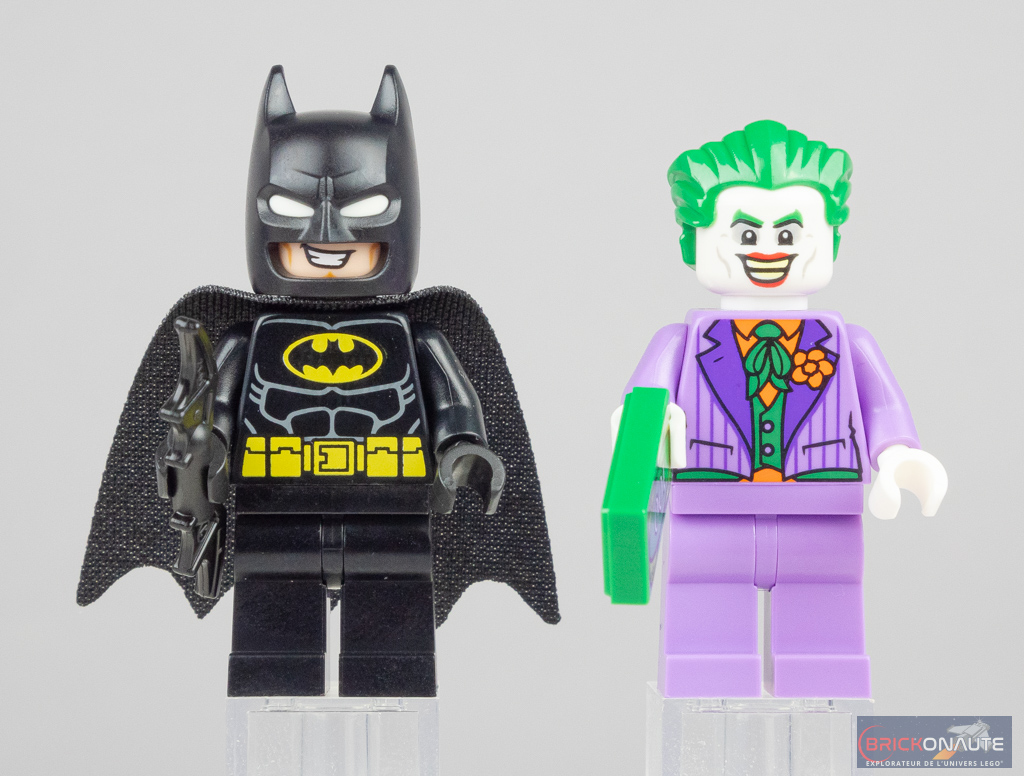 Deux minifigs sont proposées dans ce petit set, avec bien évidemment le Chevalier Noir et son ennemi juré, Le Joker. Batman nous est proposé avec son masque intégrant une partie blanche pour les yeux, telle qu’elle est présente dans les 3 sets LEGO Batman sortis début août – je vous invite d’ailleurs à retrouver mon test du set 76224 Batmobile: Batman vs. The Joker Chase par ici, et celui du set 76265 Batwing: Batman vs. The Joker par là. Cette solution permet d’éviter de tampographier la tête de Bruce Wayne avec un bandeau blanc, et le rendu est bien meilleur ainsi. LEGO réutilise ici la tête de Joey vue dans le set 10292 The Friends Apartments, un choix un peu étrange à mon goût. Le torse est utilisé chez LEGO depuis 2012, et on retrouve également l’habituelle cape en tissu.