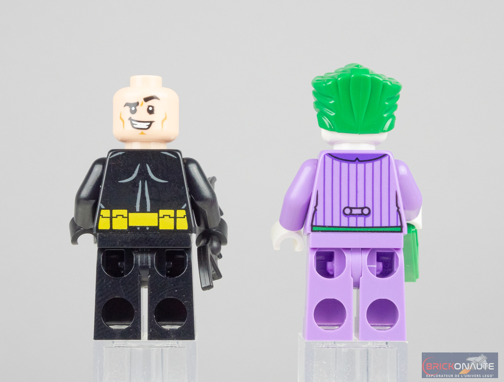 Le Joker est bien plus intéressant puisqu’il s’agit, du moins pour le moment, d’une exclusivité. Son torse qui semble inspiré de la série animée Batman est très joliment réalisé, avec cette veste rayée, cette chemise orange et la petite fleur empoisonnée à la boutonnière. Sa tête est également présente dans les sets 76224 et 76265 – dommage que les jambes soient monochromes.
