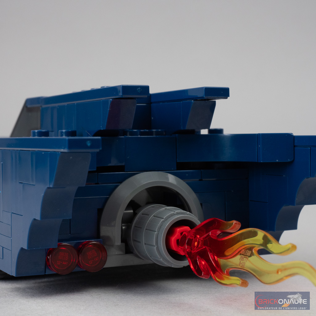 Côté jouabilité, pas grand chose à signaler si ce n’est une flamme qui tourne à l’arrière lorsqu’on fait rouler la voiture, et deux stud-shooters à l’avant facilement retirables si on veut l’exposer. Dommage que LEGO n’ait pas prévu un système escamotable ou la possibilité de les ranger quelque part une fois démontés.