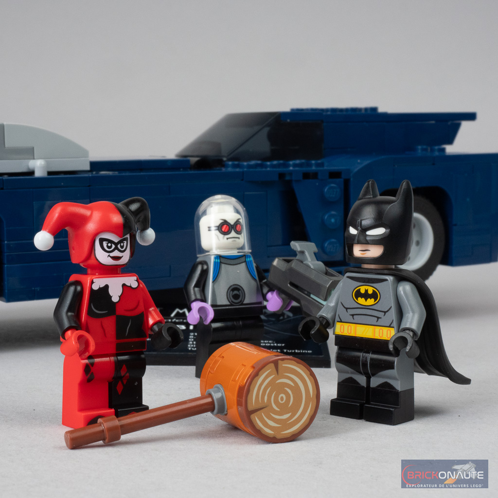Avant d’aller plus loin dans ce test, petit détour par les minifigs. Elles sont au nombre de 3 avec Batman et les méchants de service Mr. Freeze et Harley Quinn. Batman et Harley Quinn sont proposés dans des versions identiques à celles trouvées dans le très réussi 76271 Batman: The Animated Series Gotham City (mon test à cette adresse) – à une exception près. Plutôt que la cape en tissu un peu cheap, il s’agit ici pour Batman d’une toute nouvelle cape moulée superbement réalisée.
