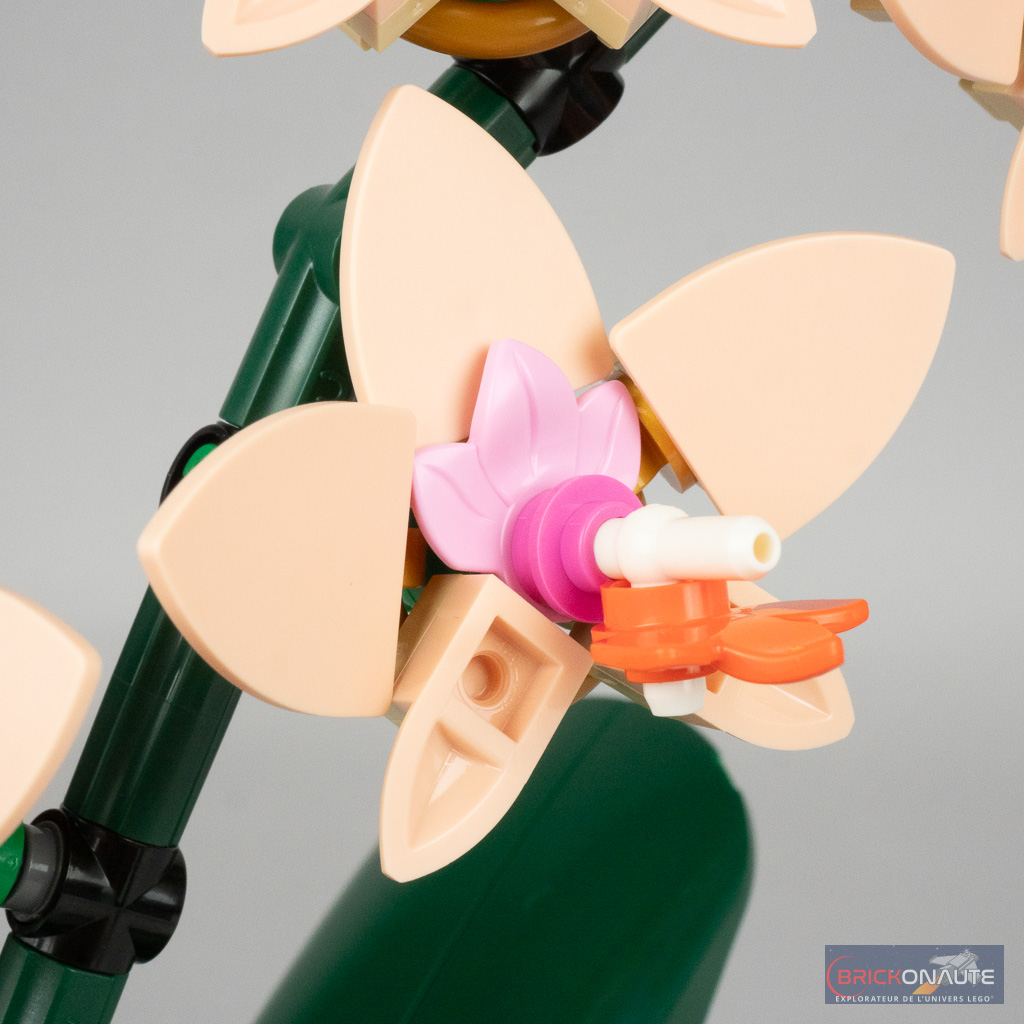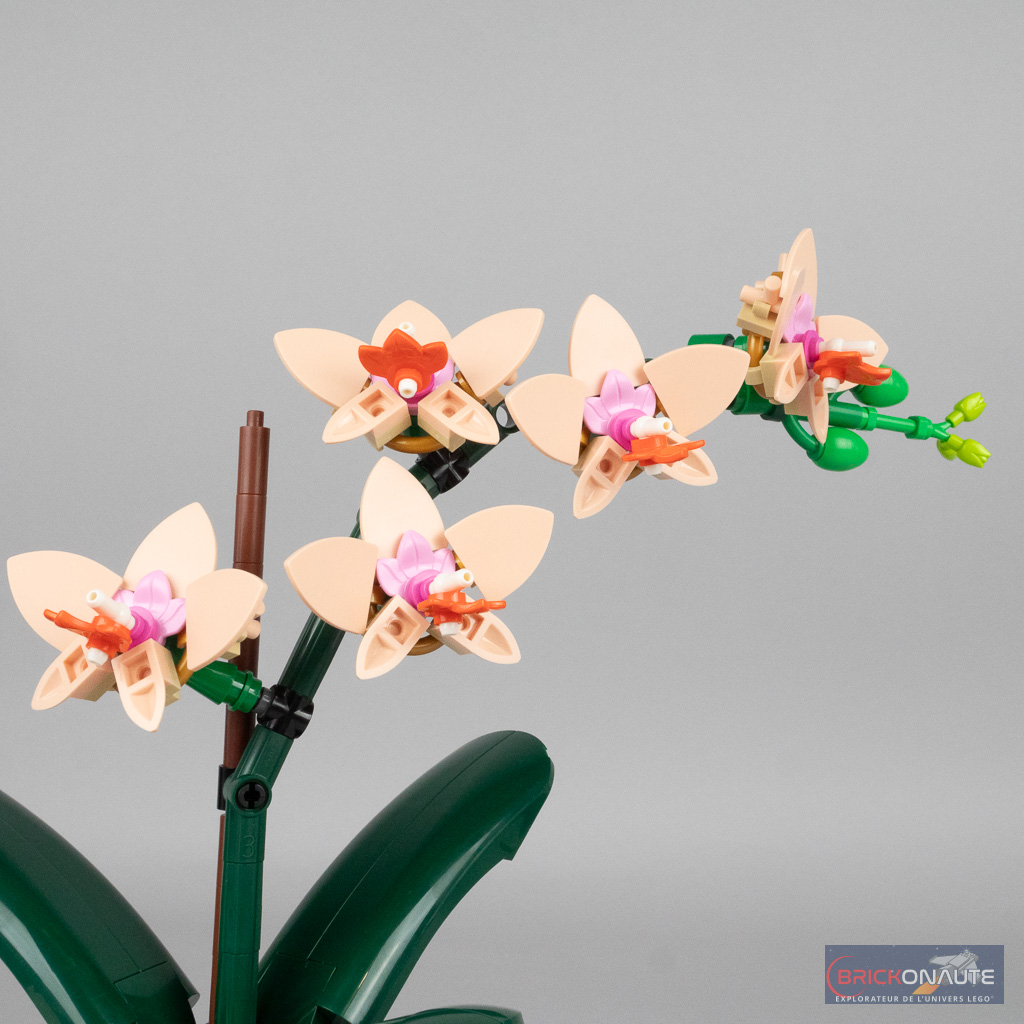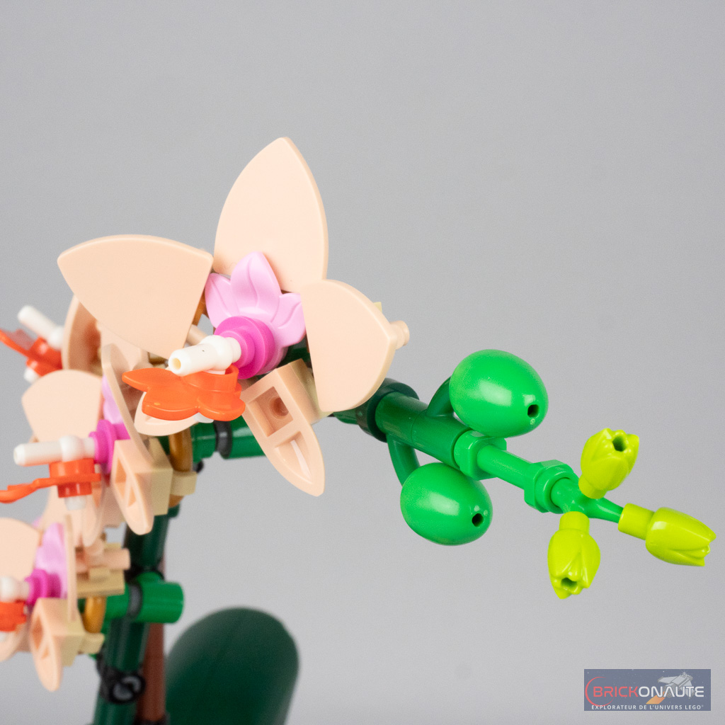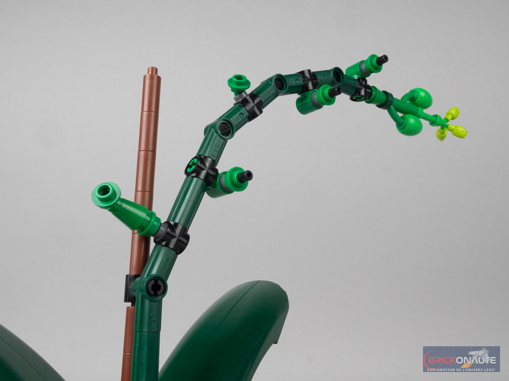 Malgré ce petit défaut la composition de l’ensemble est réussie avec une belle harmonie de couleurs et de formes. Il serait par contre temps que LEGO se décide à sortir des connecteurs à cliquet colorés, ici en gris à la base des feuilles c’est un peu dommage. L’intérieur du pot aurait également mérité un peu de « remplissage » – comme le substrat utilisé pour les véritables orchidées.