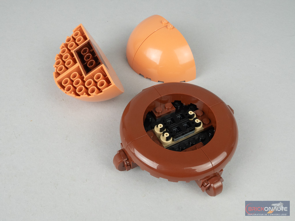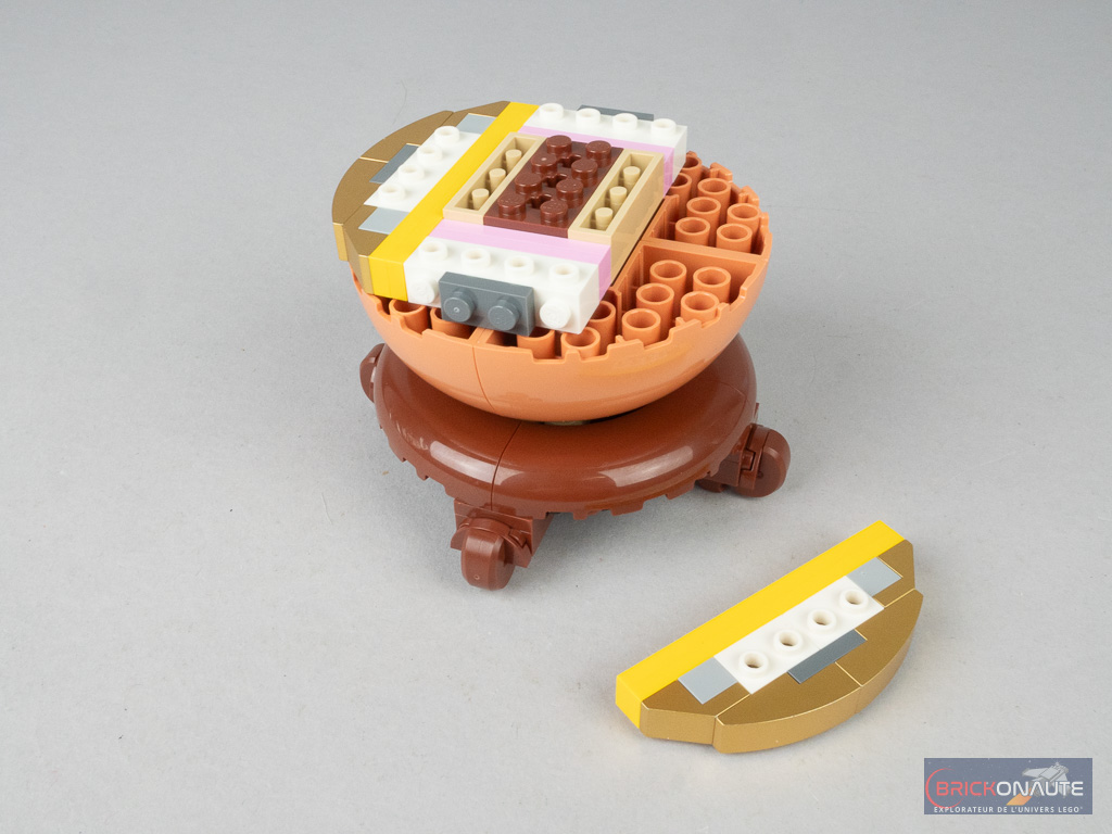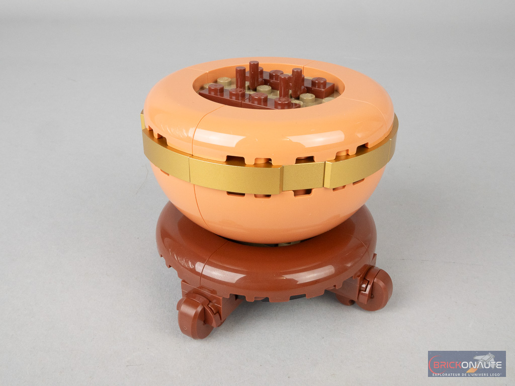 Comme d’habitude, le premier sachet sert à la construction du pot, avec une technique similaire à celle employée pour la référence 10368 Chrysanthemum : des gros quarts de dôme, disposés à l’envers sur des petites plates 1×1 avec un clip. On sécurise le tout avec des éléments en travers de la construction et notamment des briques SNOT disposées à plat, qui servent également à la construction du liseré doré. Tous les éléments nougat du pot sont des nouveautés dans cette couleur.