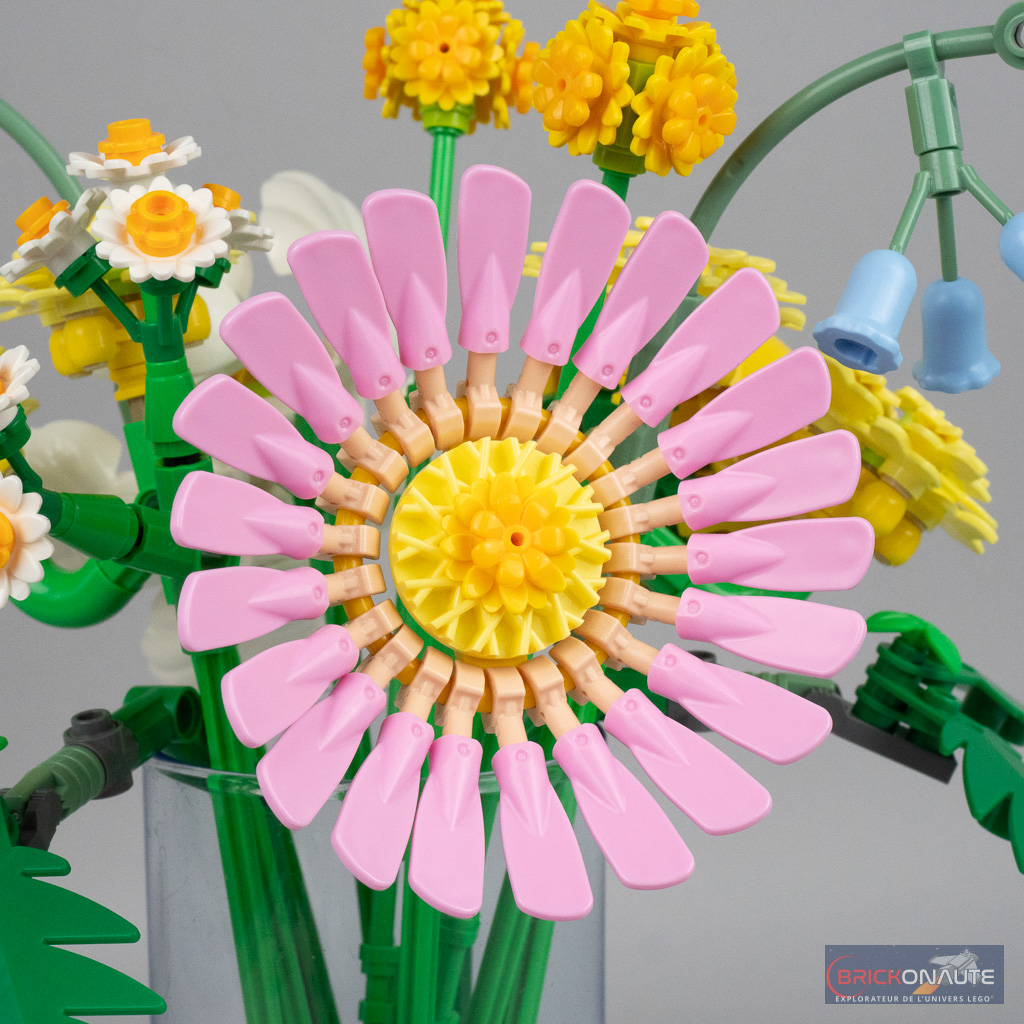 Les autres espèces sont nettement plus réussies et même si elle est simple dans sa conception (et casse-pieds à construire avec ses 22 pétales), la Gerbera (Gerbera jamesonii) fait office de vraie star du set. J’aime beaucoup également les « petites » espèces dont je vous parlais un peu plus haut, mais également l’Achillée jaune (Eriophyllum confertiflorum) qui fait un usage intéressant du nouveau connecteur Technic pour assembler deux petites « grappes » de fleurs. La fougère fait ici office de plante de « remplissage » et est particulièrement simple dans sa conception, mais elle remplit plutôt bien cet office.