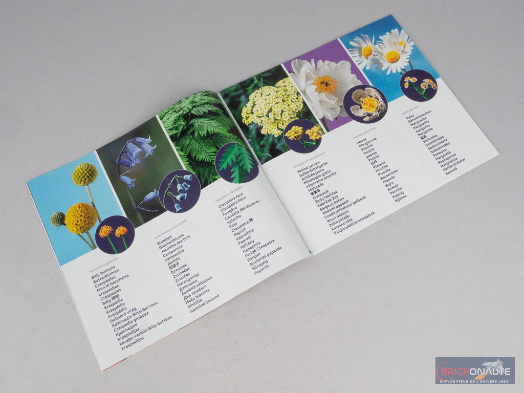 Les fleurs / plantes en plastique chez LEGO ont désormais le droit à leur propre gamme LEGO Botanicals depuis quelques mois. Dans la boîte au fond noir sur laquelle nous est sobrement présenté le petit bouquet, on trouve 4 sachets de pièces numérotés, un cinquième sachet avec quelques axes Technic verts pour les tiges, et deux notices d’instructions si on souhaite partager l’expérience avec quelqu’un. Il y a 6 fleurs à assembler par notice, dont 4 partagées entre les deux notices et deux propres à chacune. Ces deux notices commencent par quelques pages de présentation des différentes espèces assemblées, avec une photo de la vraie fleur.
