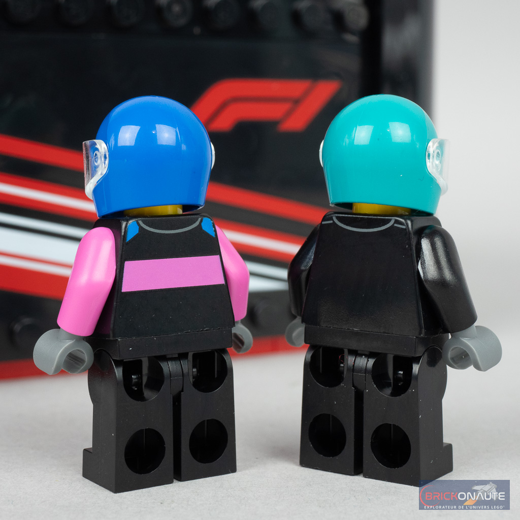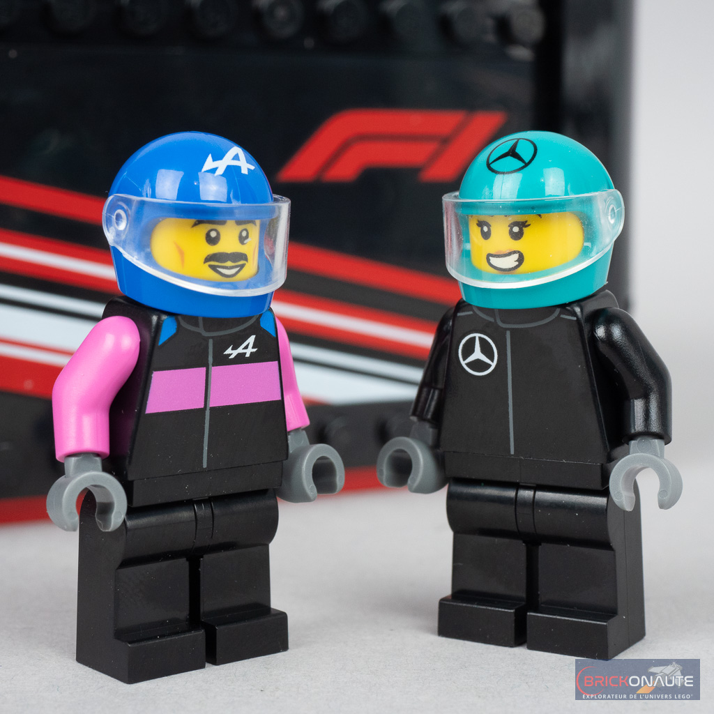 Cette boîte contient également quelques minifigs avec évidemment les deux pilotes dans des tenues aux couleurs des écuries Mercedes et Alpine, leurs casques étant également tampographiés avec le logo du constructeur. Comme d’habitude, c’est assez simple dans la conception, sans aucun autre sponsor et avec des jambes monochromes.