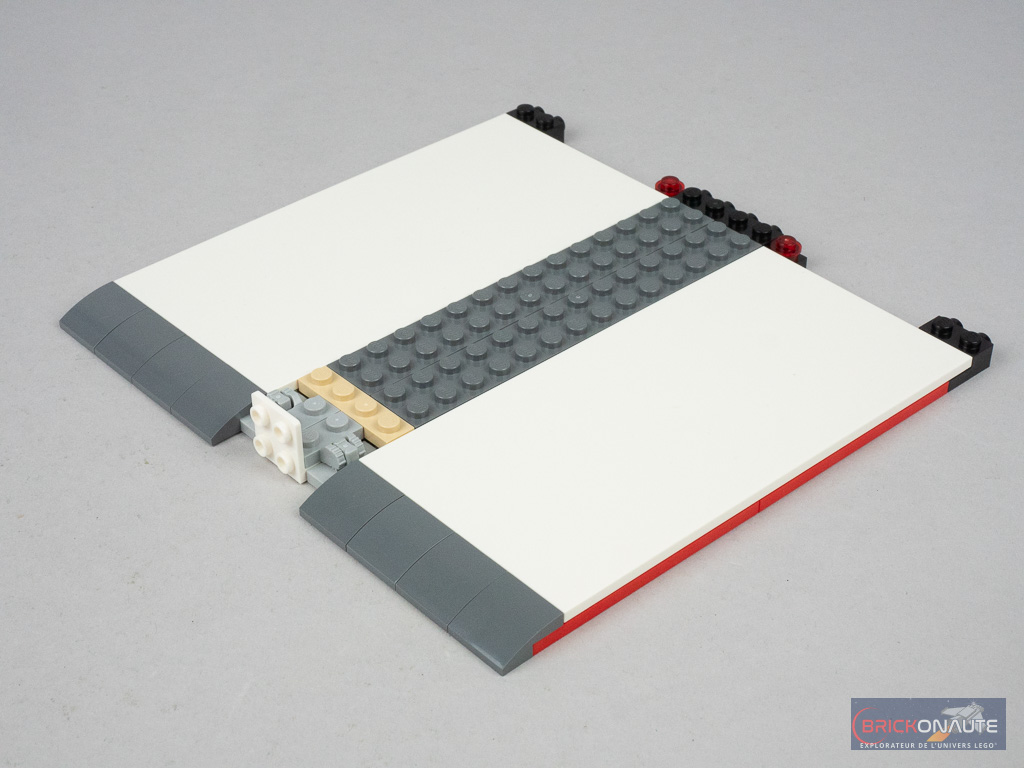 La construction du garage commence par sa partie centrale avec les deux grandes tiles blanches sur lesquelles on positionnera les voitures, séparées entre elles de 4 tenons. Un petit mécanisme bien pensé à base de pièces Technic permettra d’éjecter les voitures, après les avoir clipsées au fond, en appuyant sur un levier situé à l’arrière. Entre les deux voitures, une grande « fenêtre » pourra aussi servir de poignée pour déplacer le garage. Deux autocollants au-dessus des voitures affichent des écrans de contrôle.