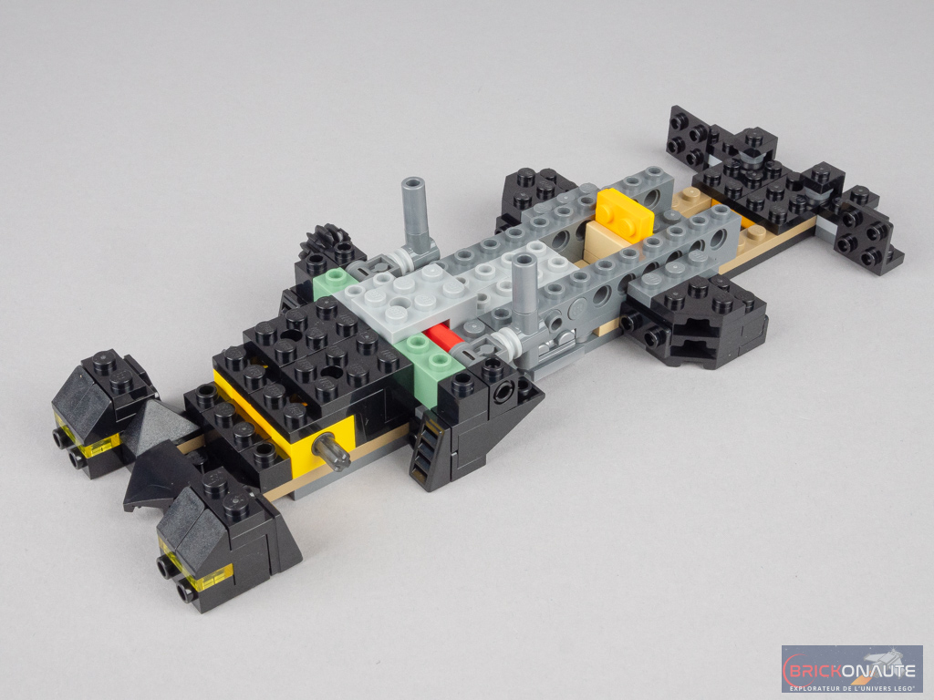 Ce premier assemblage est plutôt plaisant avec un châssis brick-built sur lequel on vient intégrer un petit cockpit et quelques fonctionnalités : une molette permet de faire sauter deux wedges pour dévoiler deux mitrailleuses, et un système connecté à l’essieu arrière permet de faire tourner la flamme du réacteur / pot d’échappement. Deux fonctionnalités qu’on retrouve sur le set 76224. Ce dernier intègre également un petit coffre à l’arrière, absent du modèle qui nous intéresse aujourd’hui.