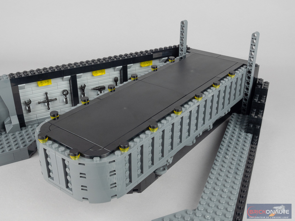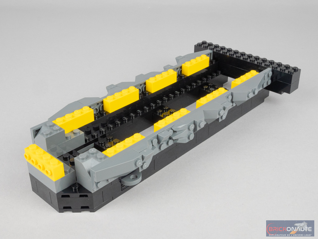 La structure inférieure terminée, on s’intéresse plus particulièrement à la partie centrale qui va recevoir la Batmobile. La construction est assez simple avec une structure creuse entourée de brackets qu’on décore ensuite de plates grises sur les côtés. Des grandes tiles noires de 8×16 tenons serviront de parking, entourées de petites lumières noires et jaunes translucides. On remarquera ici une différence majeure avec le film, dans lequel la plateforme de la Batmobile est bien plus large que cette dernière – une contrainte due au choix de présenter la Batcave dans cette « Boîte de l’ombre » à la largeur limitée.