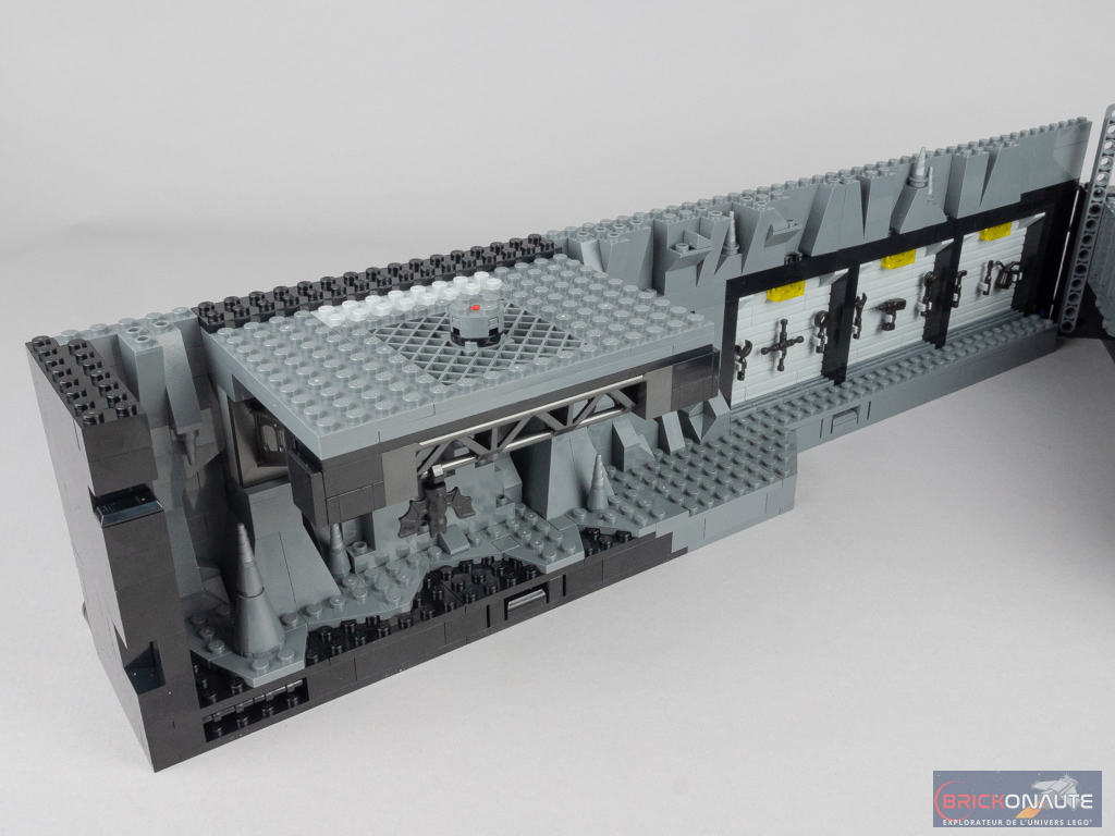 Vous l’aurez compris, on s’intéresse ensuite au « couvercle » de la Batcave et son grand symbole Batman. Sa conception est assez simple et consiste pour l’essentiel en une superposition de briques et slopes diverses et variées, pour former le symbole en négatif côté extérieur, et les parois rocheuses de la Batcave côté intérieur. La partie supérieure de ce couvercle est assemblée « à l’envers », avant d’être fixée. Les pièces grises situées sur l’intérieur font également office de renfort, rendant la partie extérieure plutôt solide.
