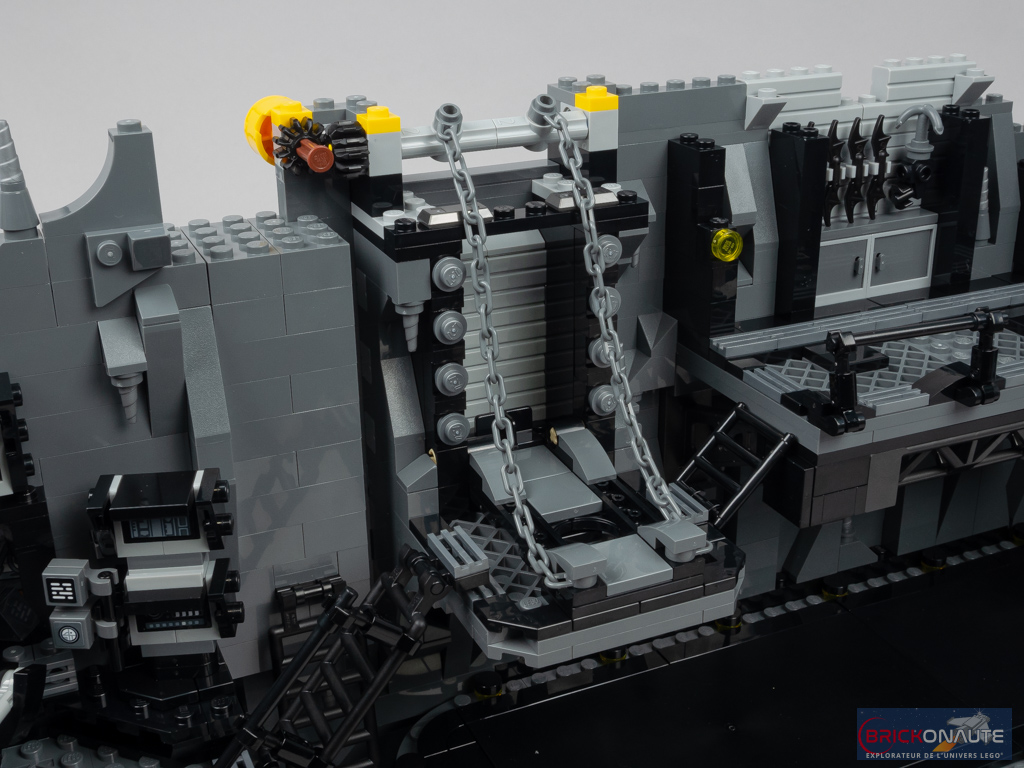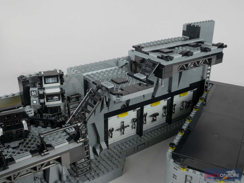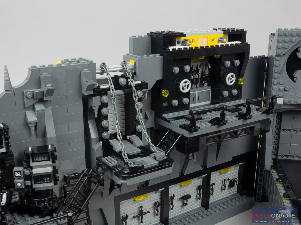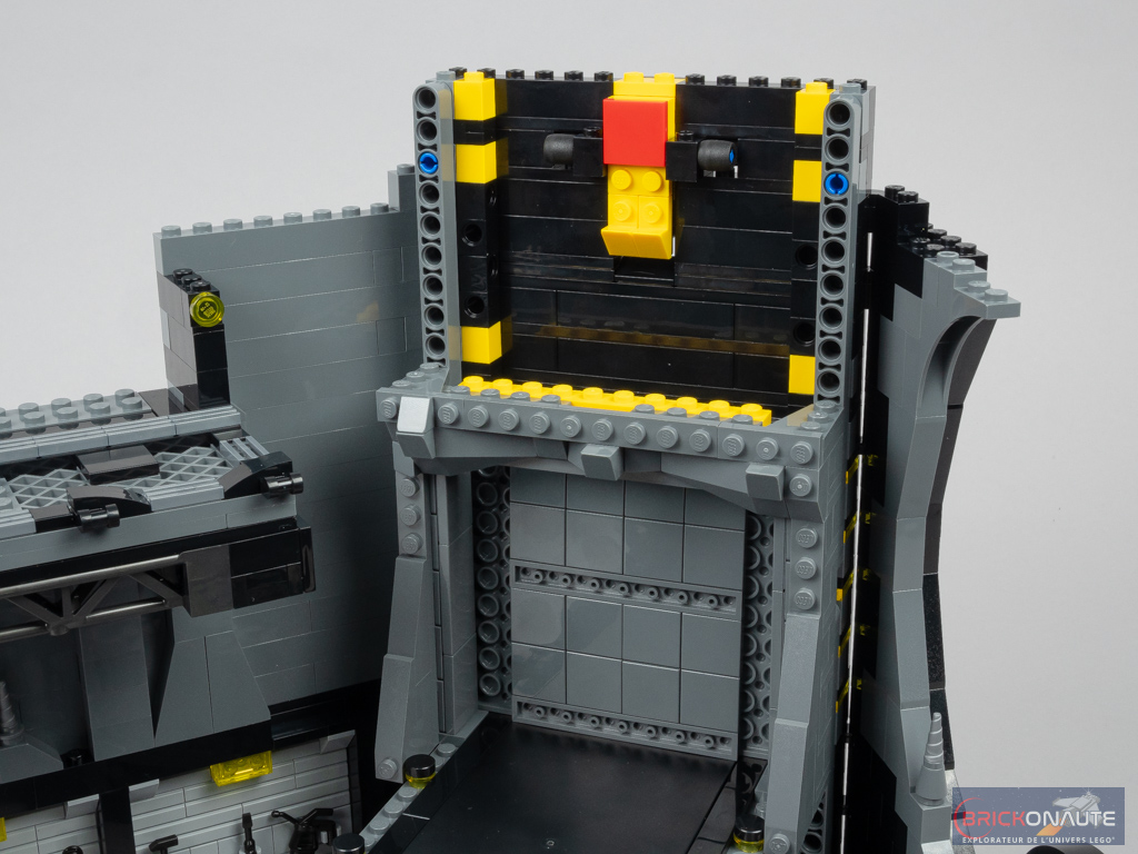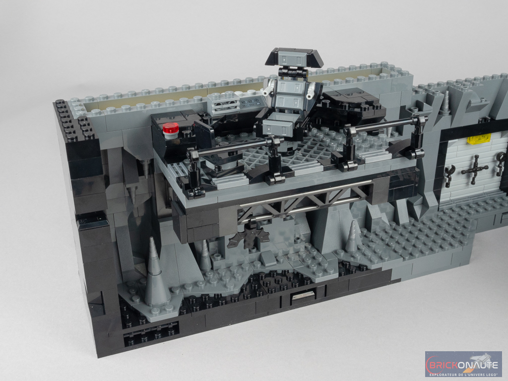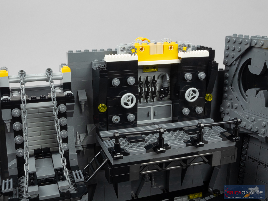 La partie centrale (presque) terminée, on retourne côté Batcave pour terminer d’élever les murs mais surtout pour intégrer les différents mécanismes. Une molette permet ainsi d’ouvrir la porte, retenue par des chaînes, devant la Batsuit. Et une brique lumineuse située juste au-dessus illumine cette tenue, dont seul le masque est visible lorsque la porte est fermée. Un autre mécanisme permet d’ouvrir les portes coulissantes révélant l’attirail du Chevalier Noir, avec un grappin et 4 batarangs. Les petits compartiments en partie basse sont malheureusement vides – j’aurais aimé y trouver quelques accessoires supplémentaires.